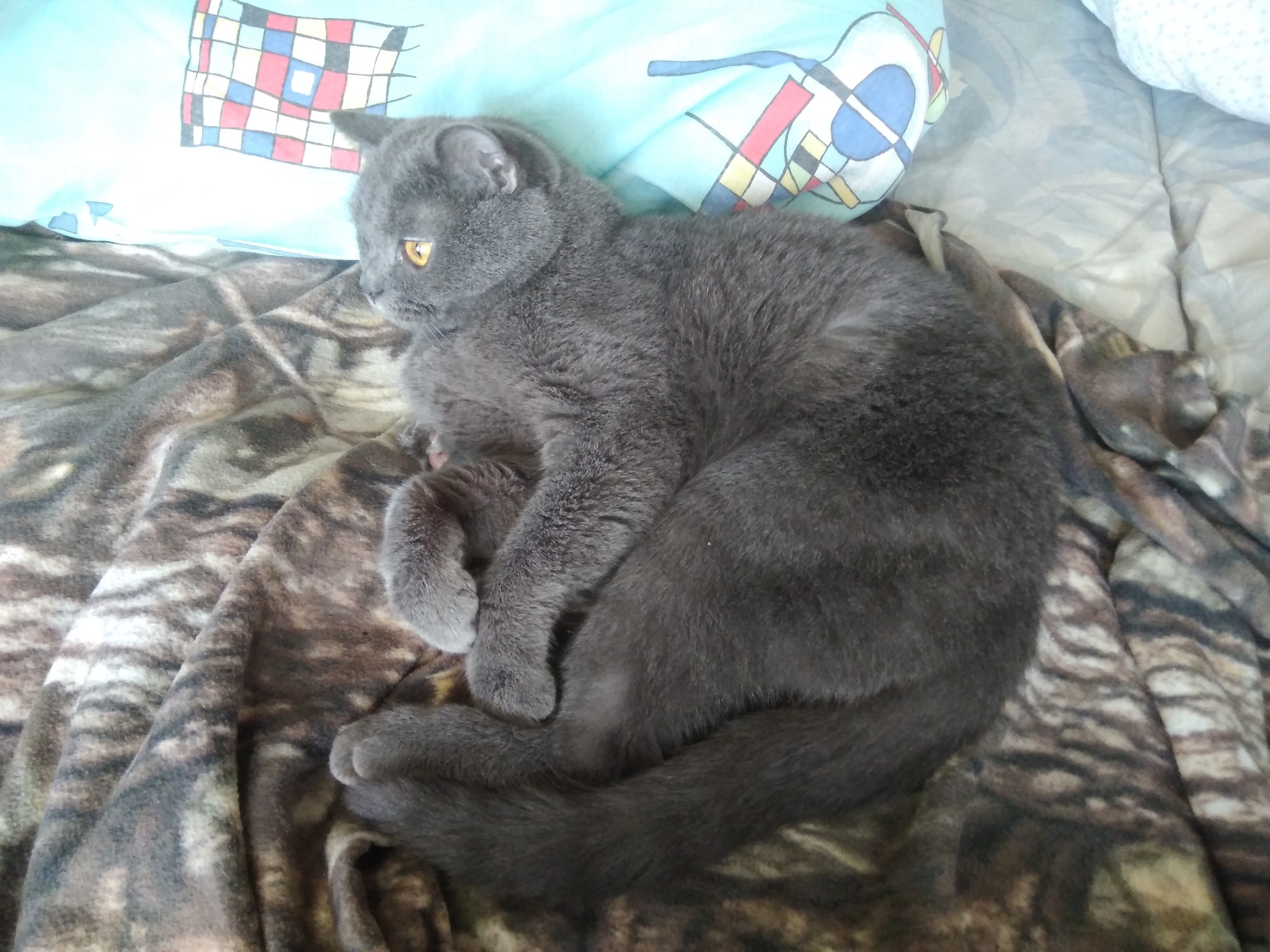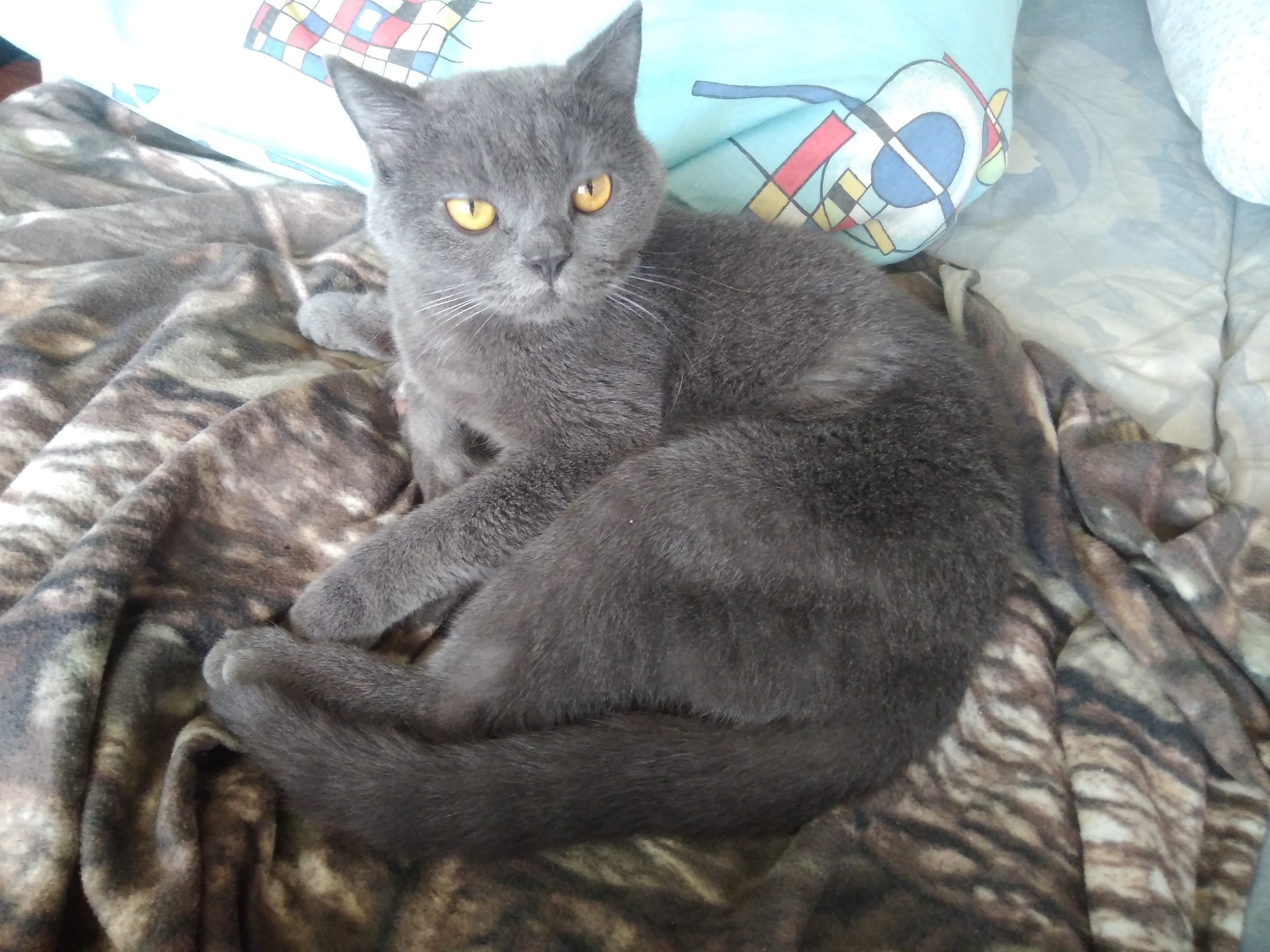 У меня кот - Вильгельм) Дома - Веля) Пришел ко мне из приюта. Решили взять котика спонтанно) Всегда хотела дымчатого кота) И тут, просматривая фотографии местного питомника увидела его)) Только позже узнала, что он породистый британец)) Ему уже было на тот момент года 1,5... И такие, оказываются никому ненужные((( Был он у какой-то бабули на передержке... С ним было около тринадцати кошек... Приехал упитанный, но очень напуганный, неприкасаемый, орал благим матом, как только, хоть надумаешь, его на руки взять... Мы около полугода ждали пока он, хоть немного попривыкнет.. Даже высчитывали, не задумываясь, секунды - сколько он дал времени, хотя бы приподнять его за передние лапки)) Там 5, 20сек... И в один прекрасный момент - он сам, впервые, запрыгнул ко мне на колени!)) Вот тогда я поняла, что его прошлое - повергнуто! Мы справились))) Теперь прошло 2 года... Нет, он не стал классическим ласковым, покладистым котом..) У него характер - королевский, предназначенный породой и его собственной судьбой!)) Он очень гордый, выборочный, но мы с ним нашли свой тандем))) Он всегда меня встречает) И у нас появилась с ним общая традиция - каждый раз, когда я ложусь спать, он сам приходит ко мне погладиться)) Но ненадолго мин на 10.. Пока ему не надоест)) Потом встает и уходит) Но и это очень приятно и ценно -его доверие!)) Только мне он позволяет всё!)) И я это уважаю)) И Веля взамен очень правильный - ни разу мимо не нагадил, ничего существенного не испортил и т.д... Чувствуется в нем естественная благодарность за то, что наконец попал в любящую семью))) И порой, действительно, взрослый кот "с улицы" понимает много больше, чем взрощенный дома... Конечно, раз на раз не приходится... Но знаю, помимо нашего, несколько случаев подобных...