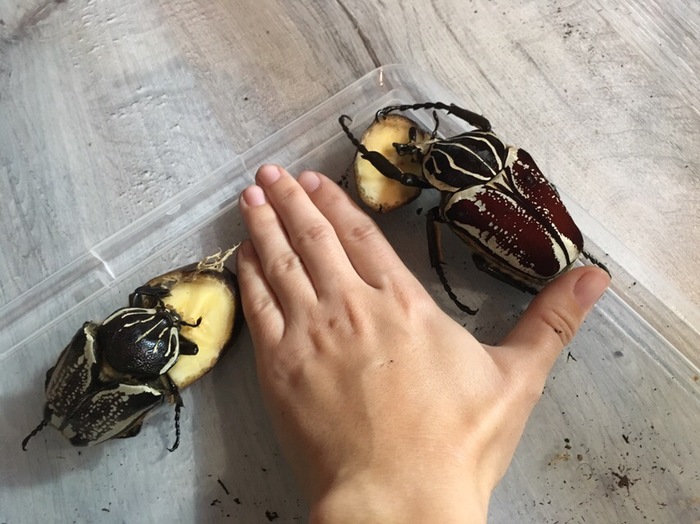 Содержание Голиафов - дело не особенно сложное, они кушают бананы и манго, у меня также ели детское пюре Агуша, оставшееся от реснитчатого бананоеда, которого мне отдали на пристройство в приют Сутулый Ящер (так я называю свою комнату, в которой у меня живут разные рептилии, попавшие ко мне безвозмездно, в виду каких-либо травм или проблем со здоровьем). Некоторым я ищу любящие руки, но большинство оставляю себе.