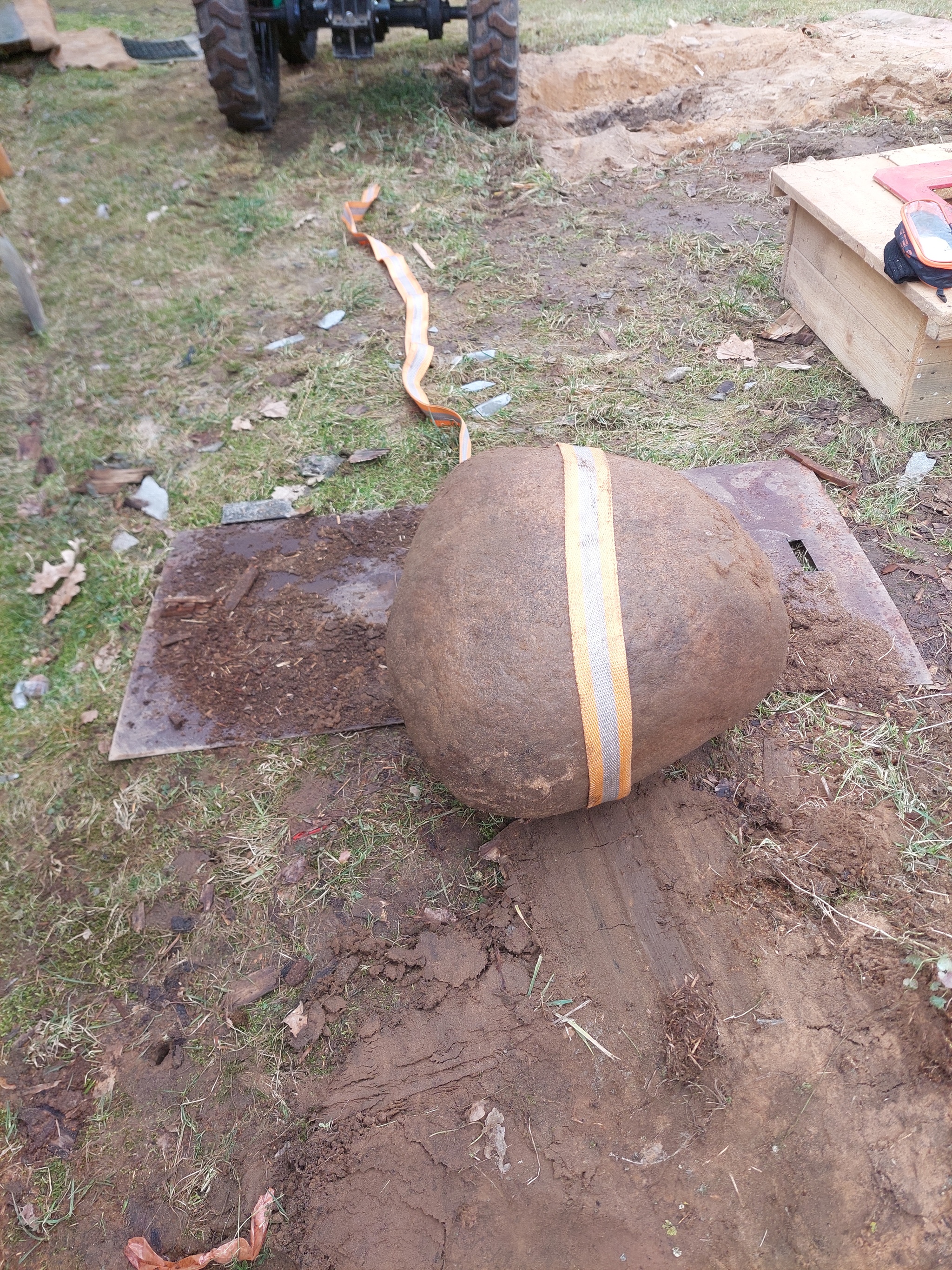 Через два часа, семь потов и одно проклятие в адрес геологии я таки водрузил первый валун на лужайке (первый блин, как известно - комом, уже вытащенный каменюка при транспортировке скатился с листа и бодренько завалился обратно в свою ямку).