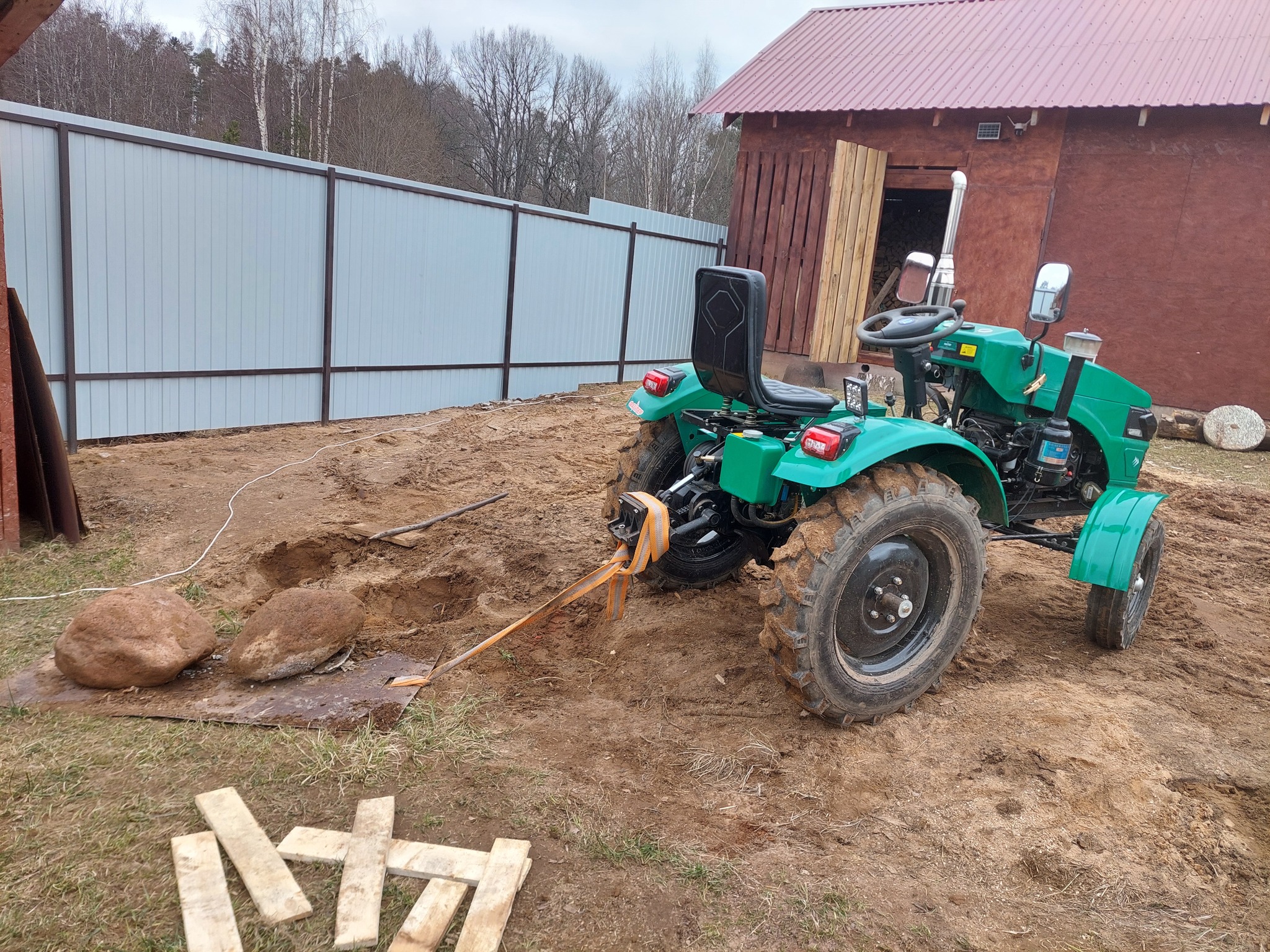 Сначала я попытался сдвинуть первый камень. Он не шелохнулся. Тогда я вооружился ломом, лопатой и тракторком. Ну и волокушу из старого стального листа смастырил.