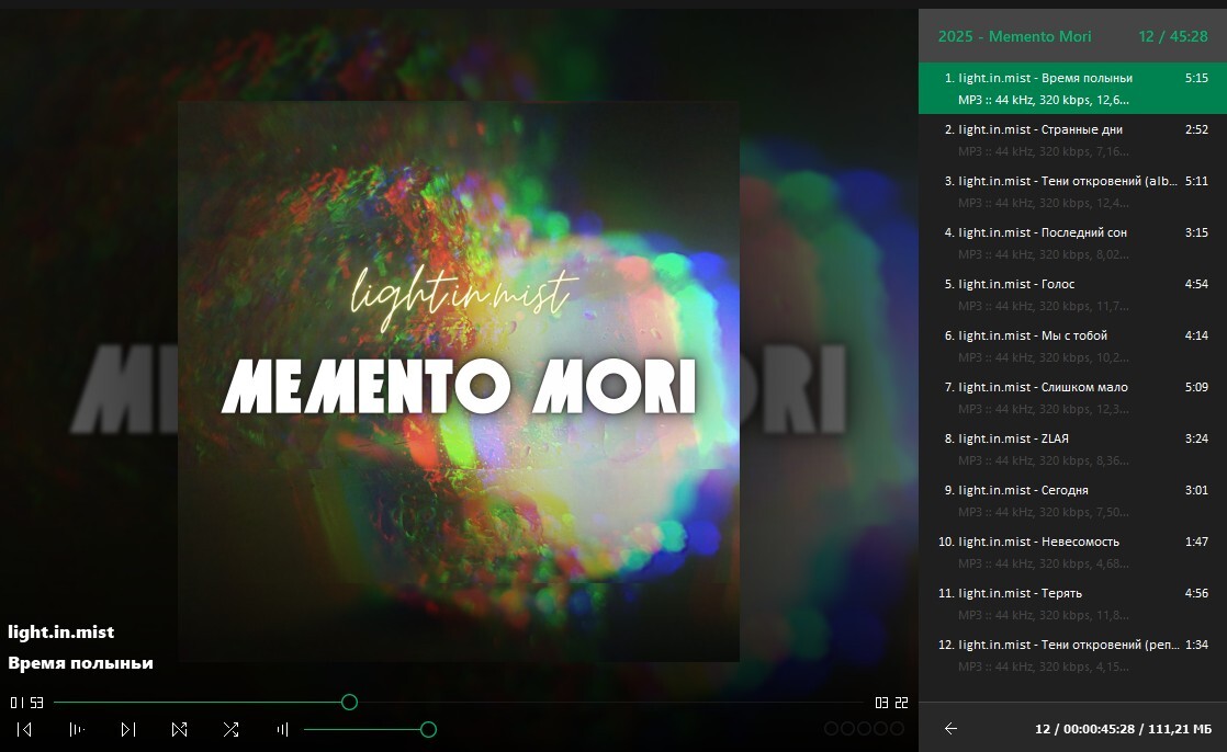 Всем привет! Сегодня в полночь наконец-то выйдет мой большой и серьёзный труд – музыкальный альбом "Memento Mori". Для меня это очень важная и особенная вещь, поэтому сердечно прошу слушать музыку и делиться ей с другими, если понравится.
