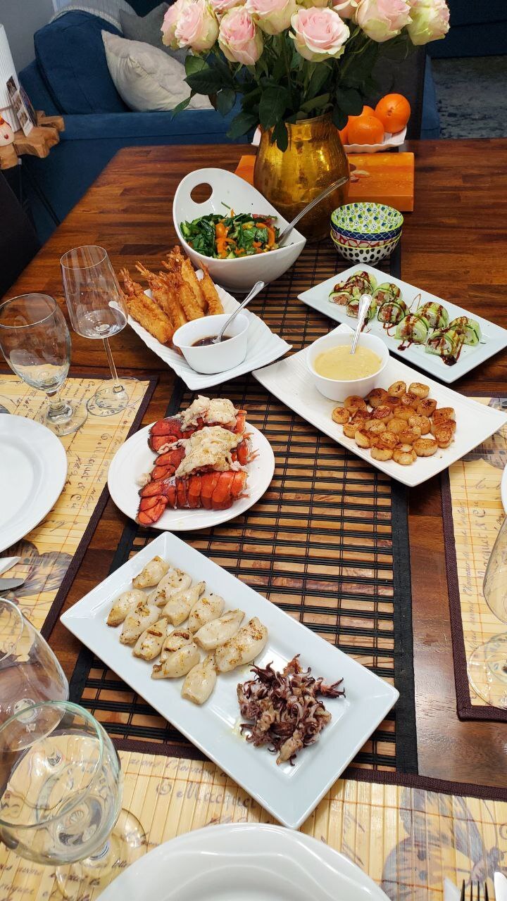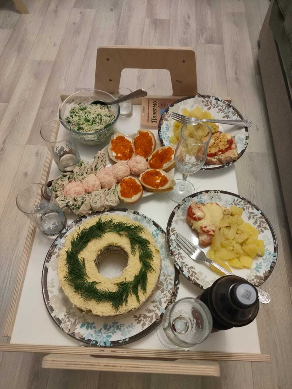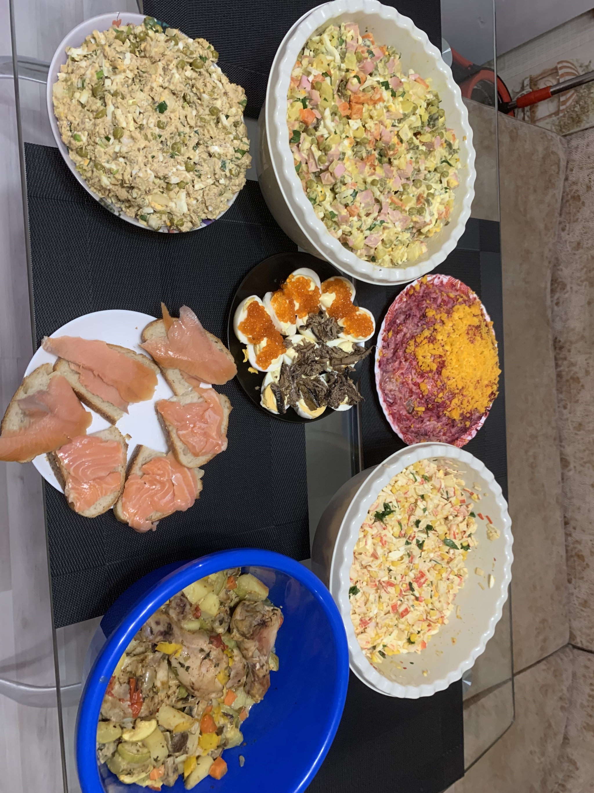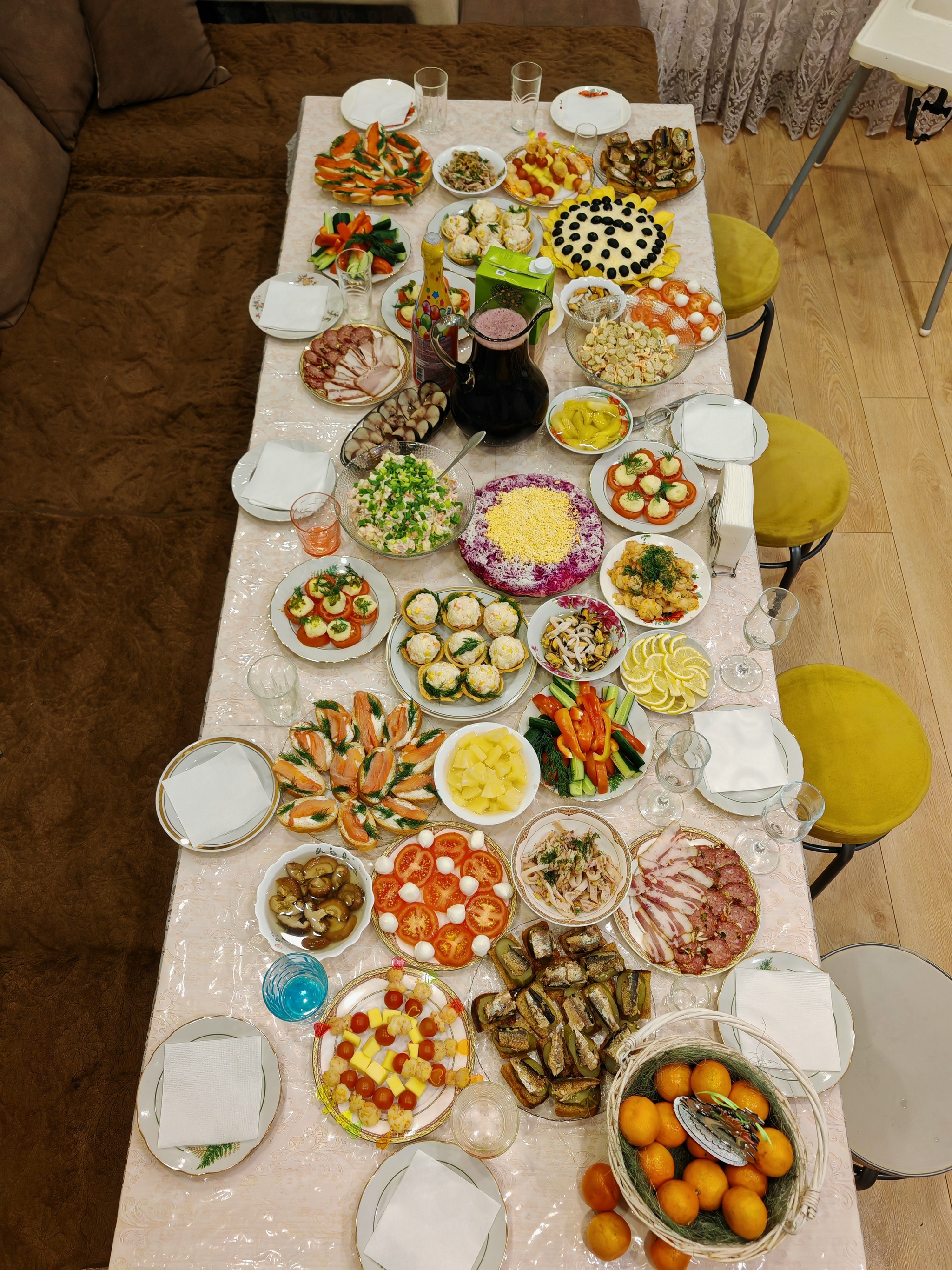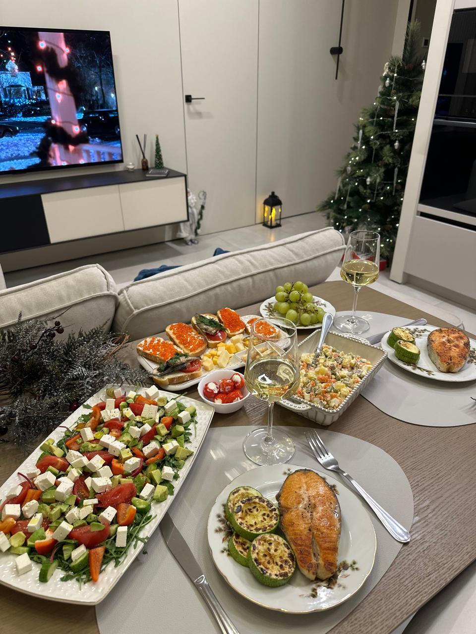 Я решил не тухнуть дома один, собрал ещё двоих одиночек и отметили)стол накидал за два часа) сам готовил только овощи на пару) остальное только нарезал)
