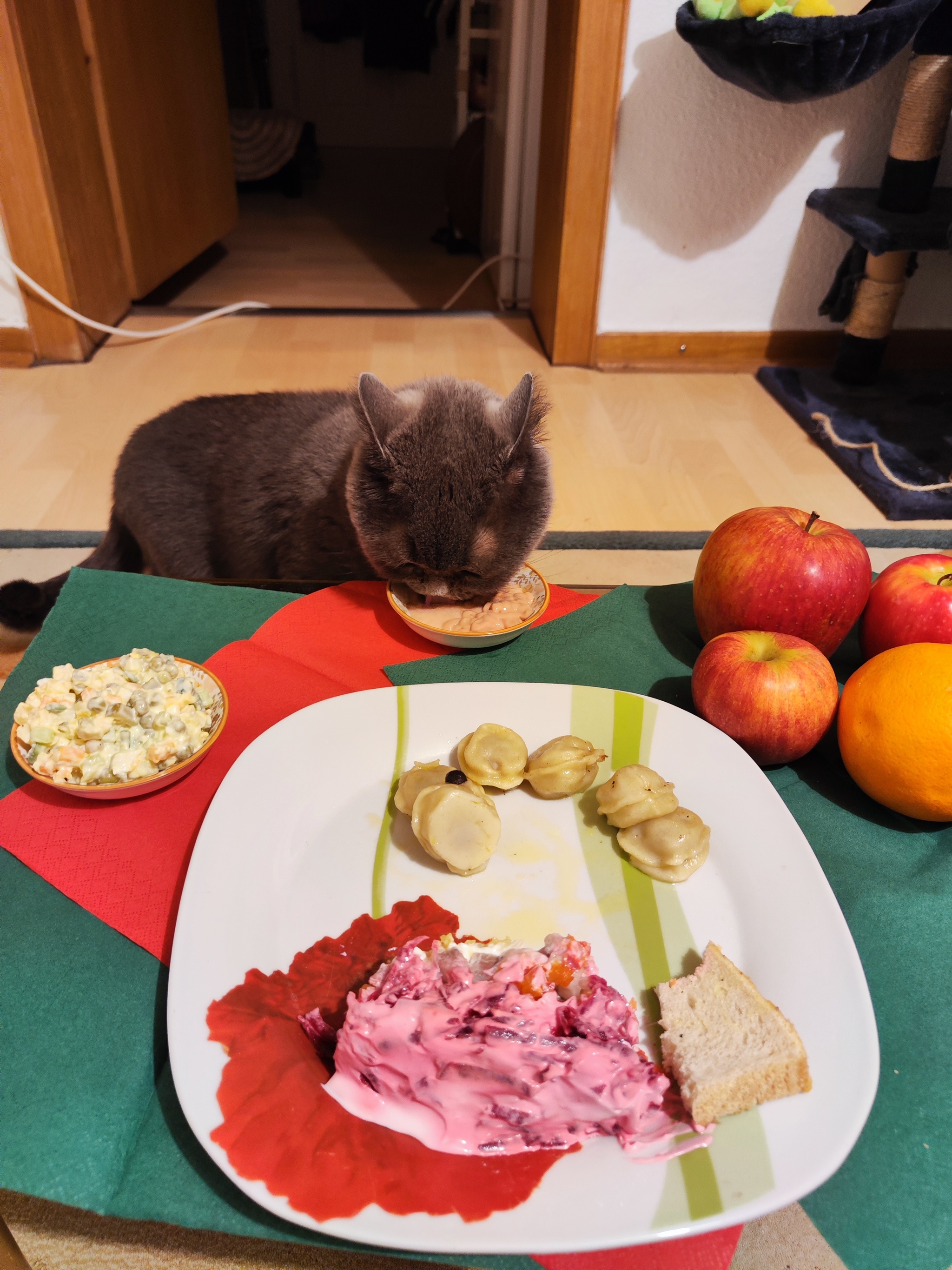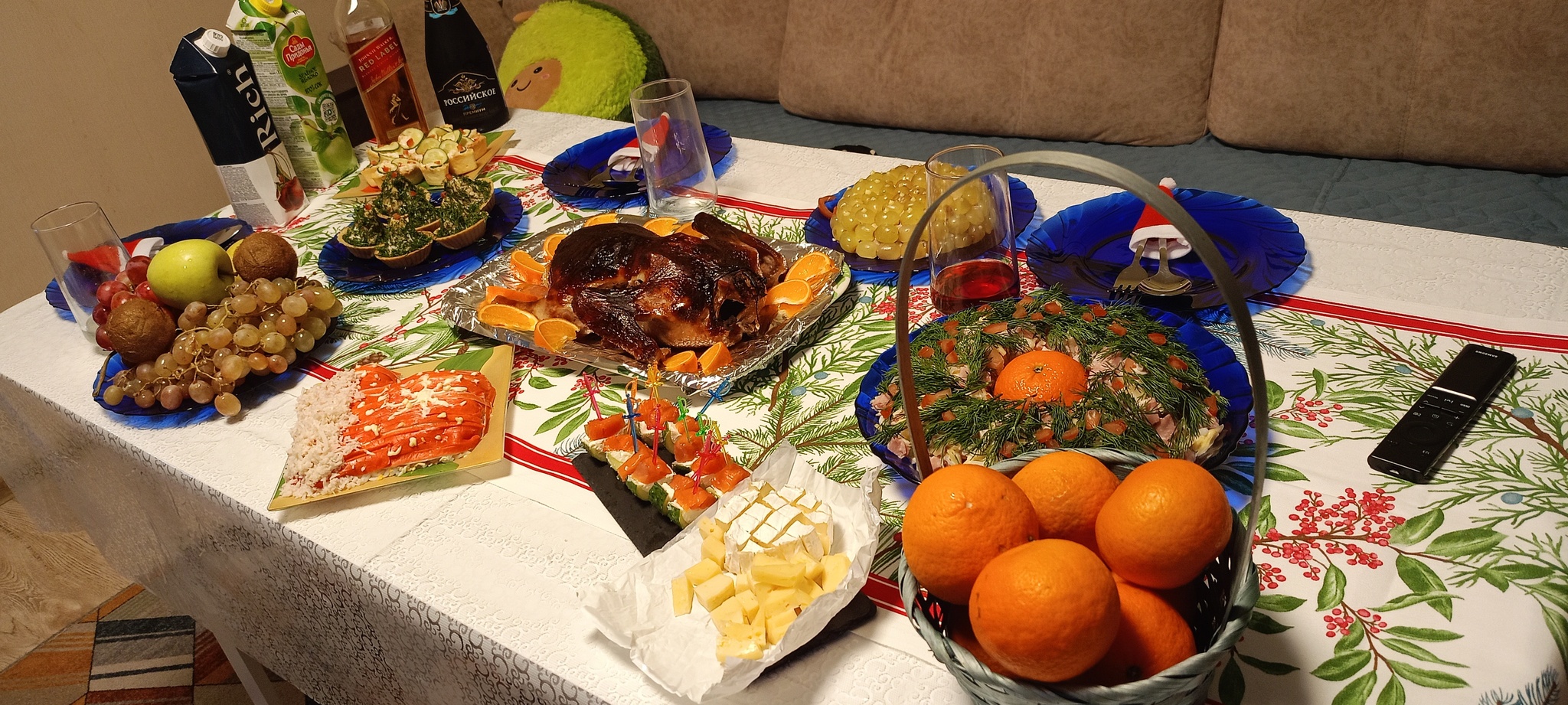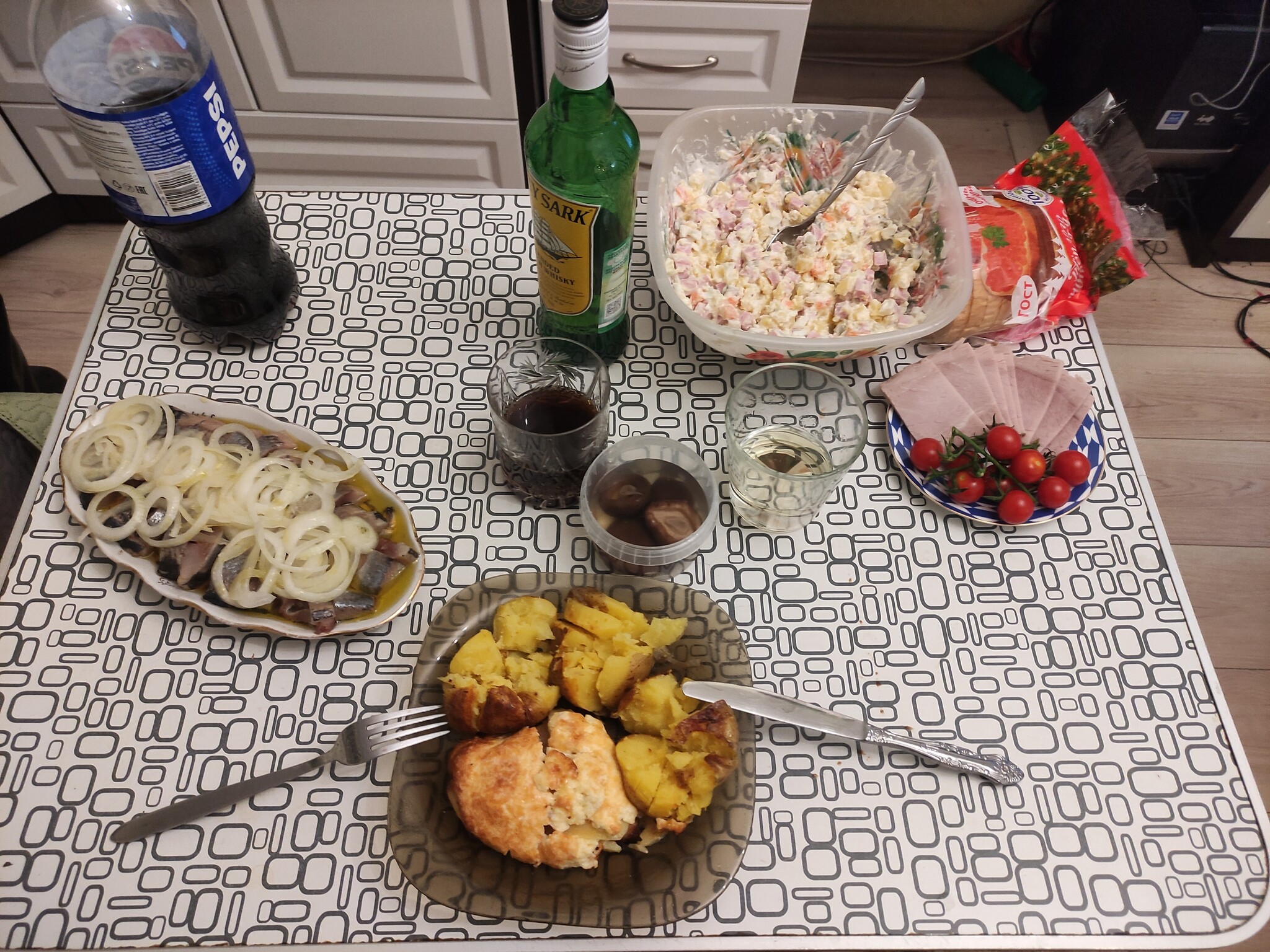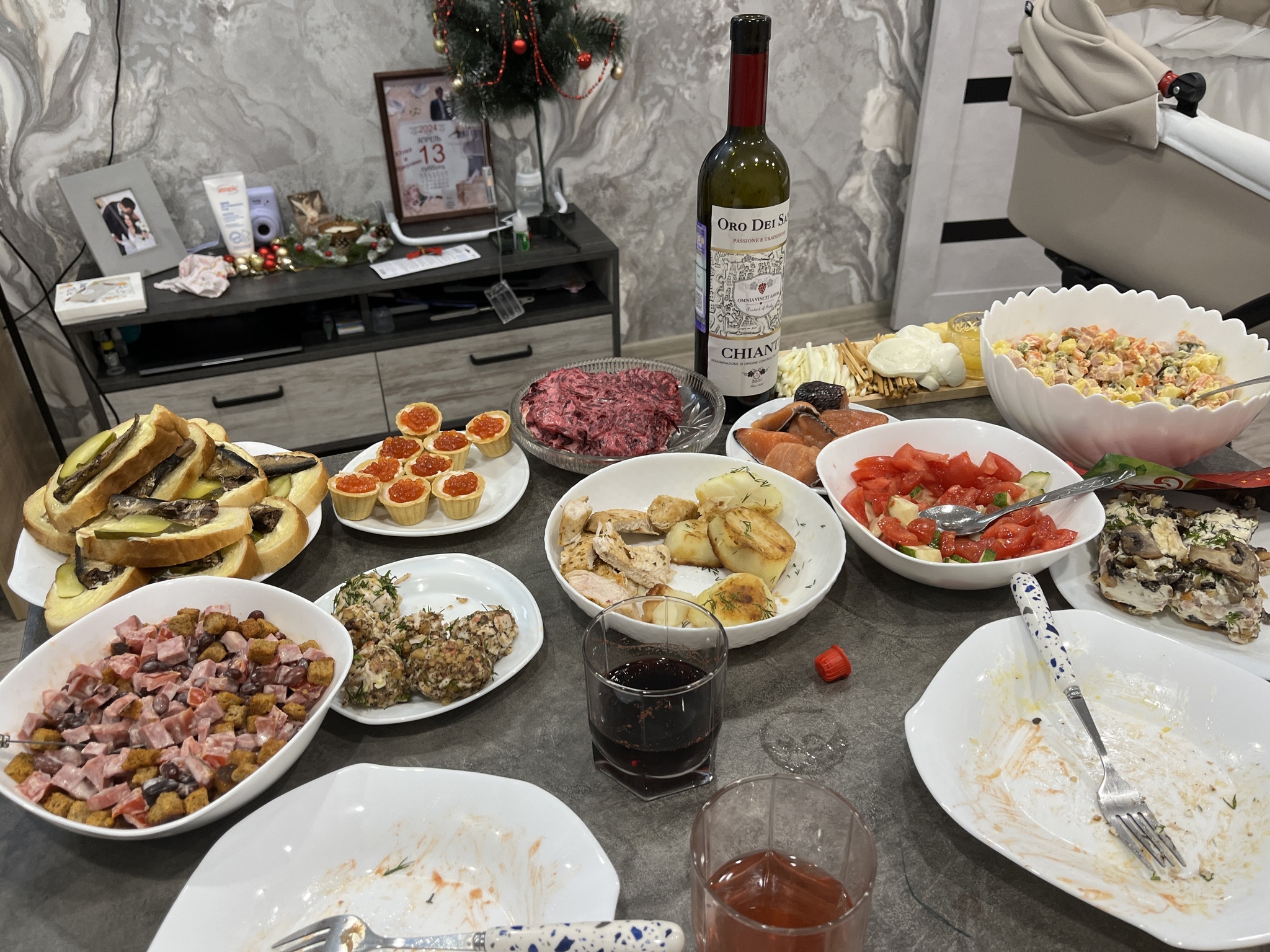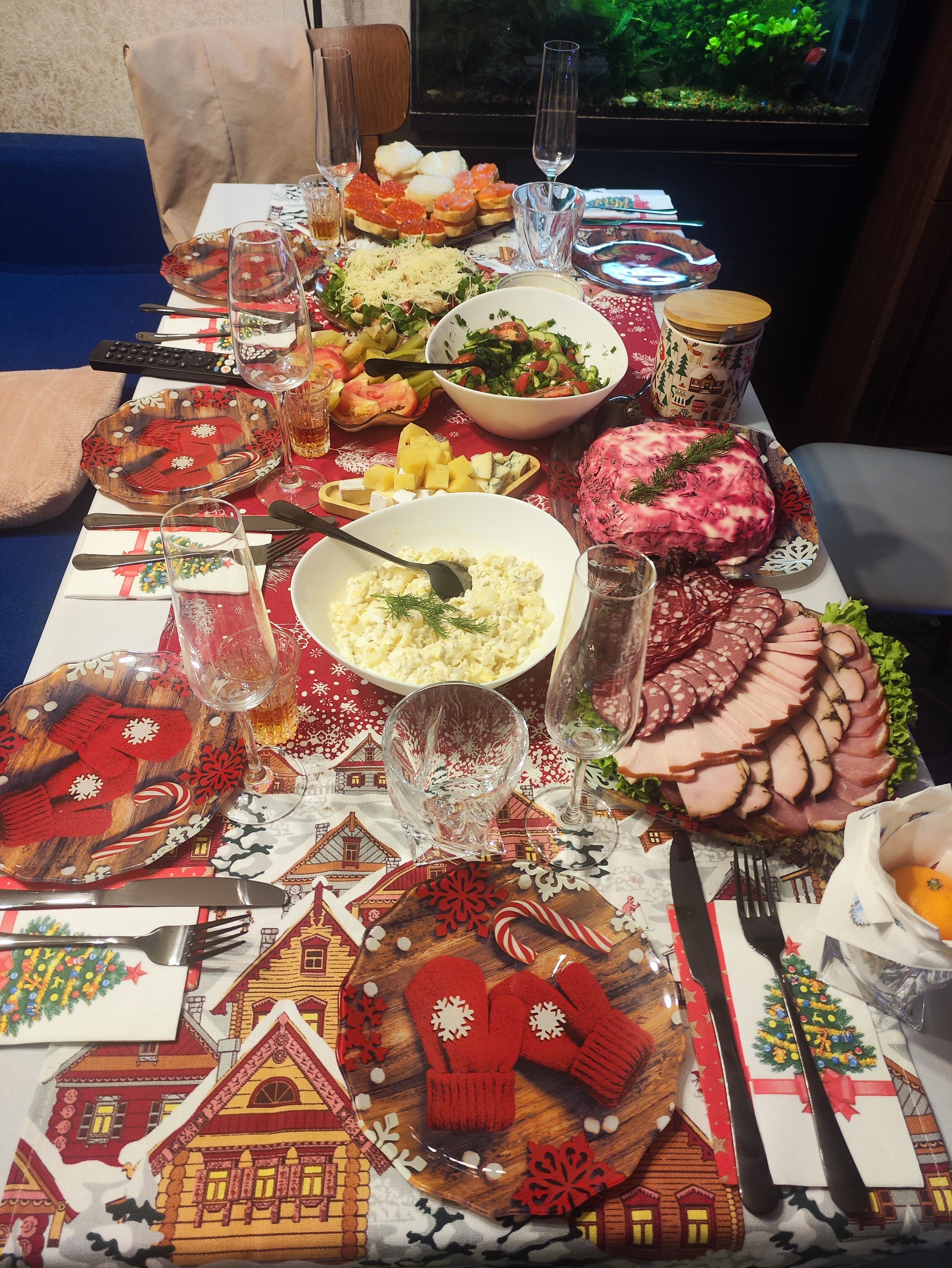 Слишком скромно! Пельменей даже по меркам будней мало, водки, если только чекушечка где-то под стулом спряталась, мандарин сиротливый, и лишь оливье, несмотря на алюминиевую одёжку, выглядит бодро!