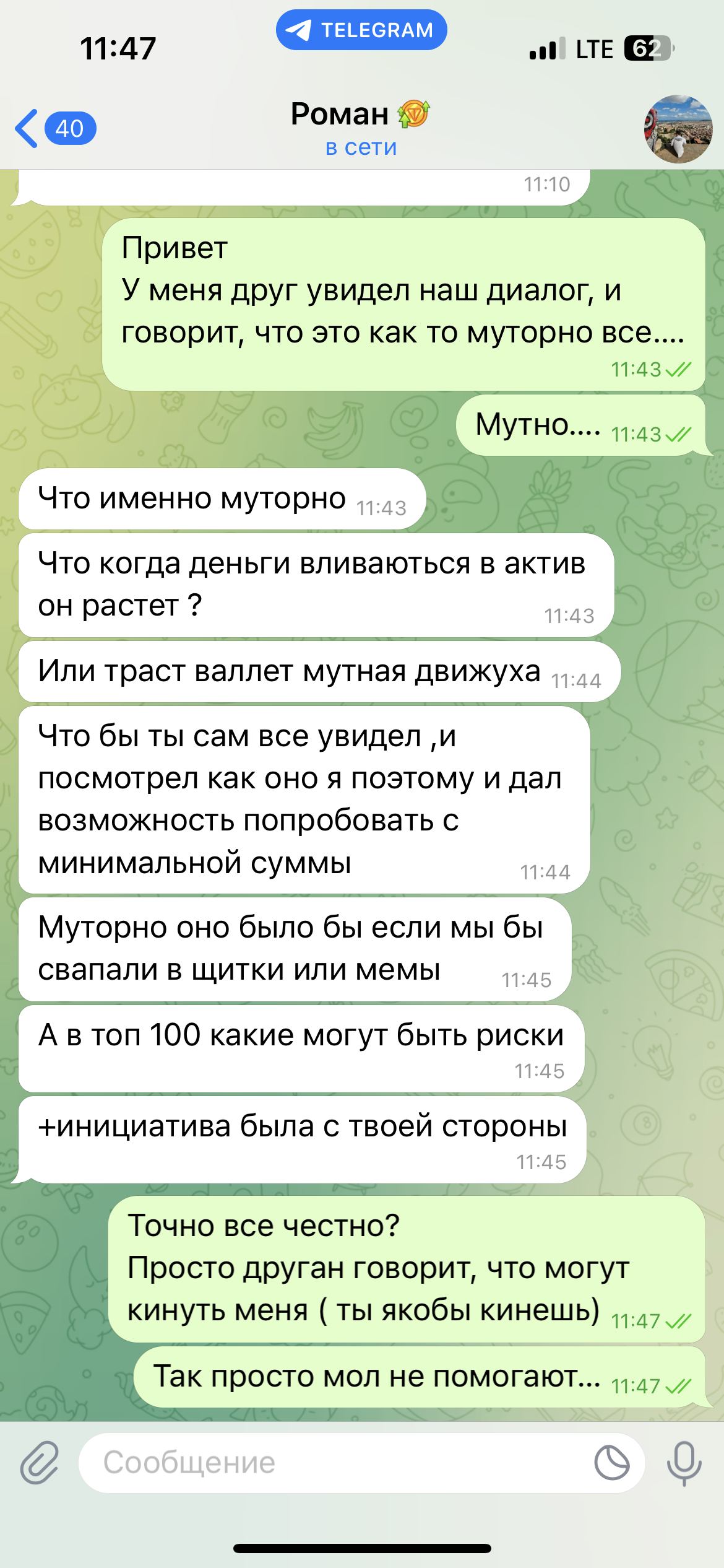 Потом появился еще один персонаж в этой истории. Мой давний кореш узнал о общении с новым знакомым(Романом). После чего стал меня отговаривать от этой работы/обучения. Дав понять, что меня кинут в итоге.