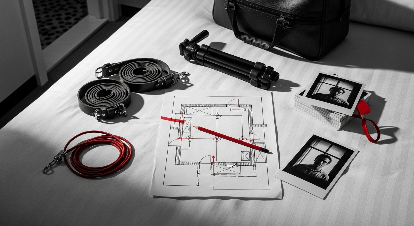 Она увидела на кровати план-схемы того, что можно было описать только как «сексуальное подземелье». Были наброски комнаты, различного оборудования и фигуры, изображённой в нескольких позах — закреплённой и связанной. Но позвонить в полицию её заставило не это. А то, что лежало рядом…