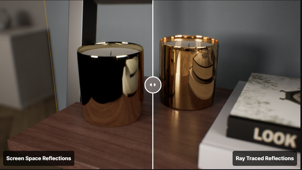 В Screen Space Reflections нет отражений объектов за пределами кадра, а в ray traced - есть. Ну и сами отражения лучше.