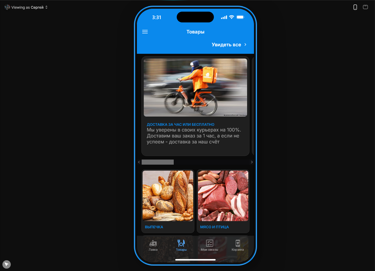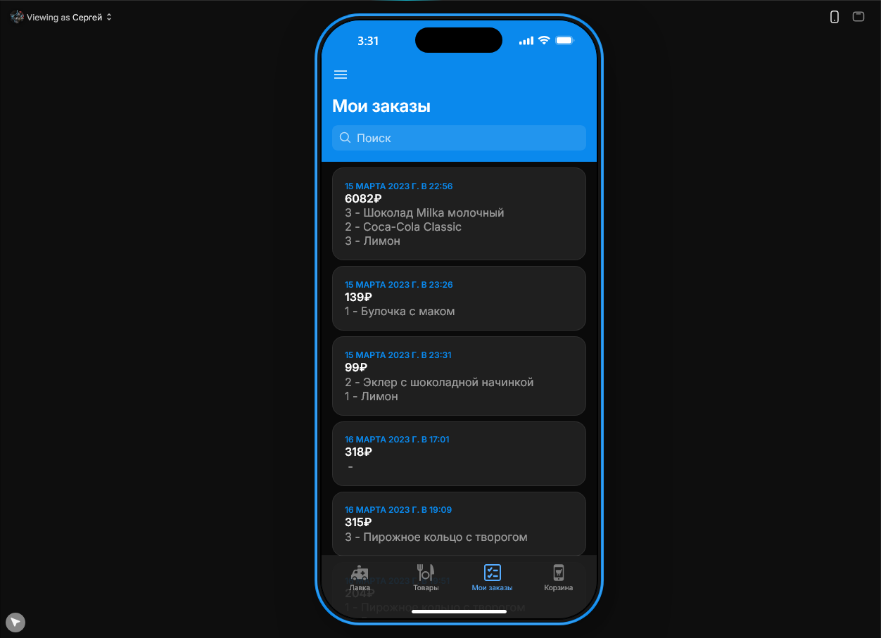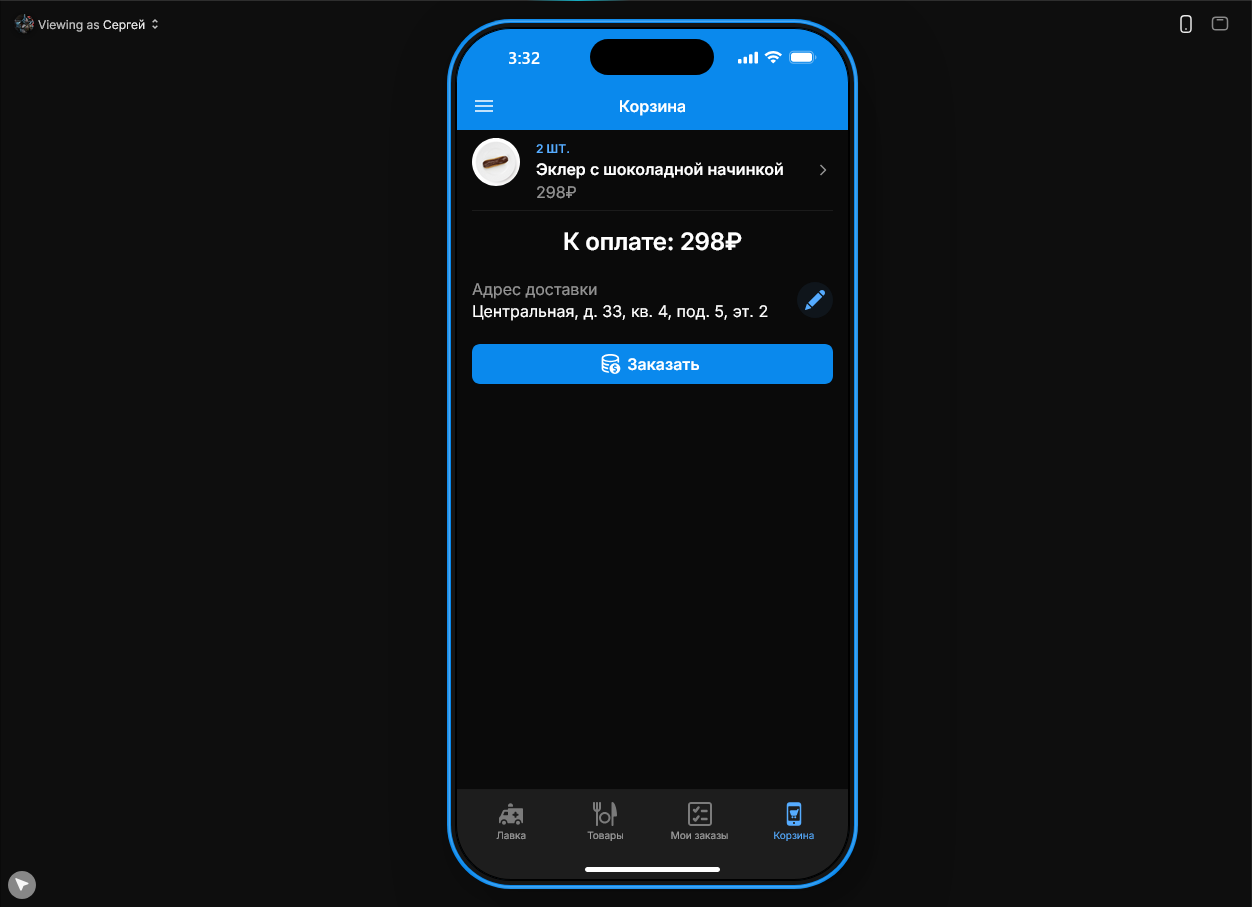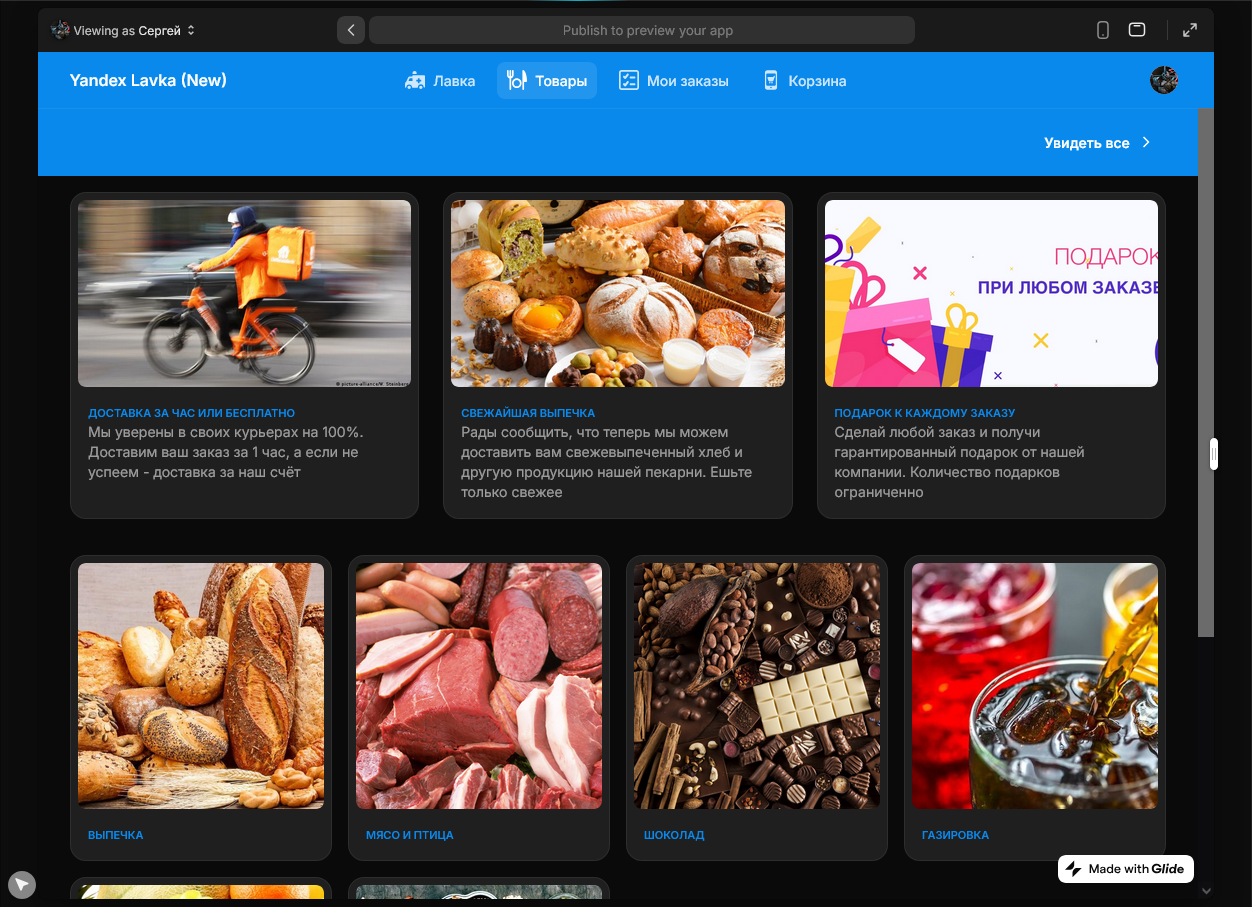 Уже в феврале я приступил к работе: сначала собирал демо‑приложение «Яндекс Лавка», затем — аналог Qlean. Процесс выглядел так: я настраивал навигацию между экранами, назначал им заголовки и иконки, добавлял на каждый экран кнопки, формы и списки, а данные привязывал к таблицам вроде Excel, Google Sheets или внутренних таблиц самого Glide. В ячейках таблиц можно было создавать простые формулы, чтобы, скажем, автоматически пересчитывать стоимость заказа. Также я реализовал роли пользователей — админы видели расширенное меню и могли менять статус заказа. Финалом стала попытка интеграции сервиса Make для автоматизации отправки SMS-сообщений после оформления заказа. Само сообщение я не получил из-за недостатка денег на счёте сайта, который этим занимается, но я удостоверился что сервис работает.