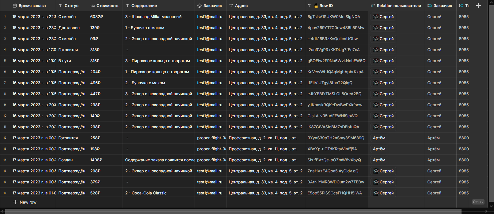 Следующим этапом стало создание админского приложения, в которое загружалась таблица от предыдущего приложения с целью связать заказы и их статус. Админ может смотреть заказы с разными статусами (подтверждён, готовится, в пути, доставлен, отменён) и менять их.