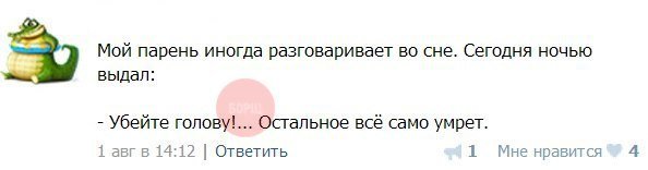 1616 Julie666 Мой парень иногда разговаривает во сне. Сегодня ночью выдал: 12 лет назад - Убейте голову!... Остальное всё само умрет. [моё] Интересное Парни Девушки Юмор