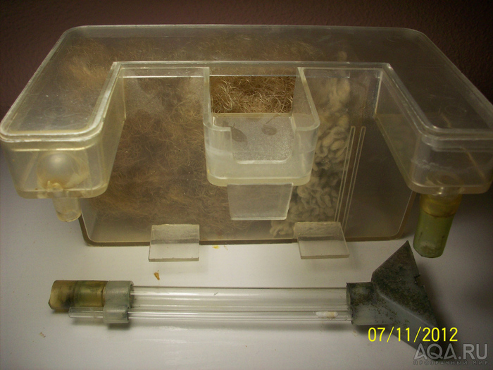Итак, вся стойка заполнилась аквариумами. Рыбок, водоросли и улиток брали у знакомых и одноклассников. Насколько помню были барбусы, гуппи, скалярии, меченосцы. Грунт - искали специальный песок и камни просто на улице, потом кипятили минут сорок и клали на дно аквариума. Также у нас было специальное оборудование для аквариума - аэратор с очисткой, там сложная была система, в одну трубку забиралась вода, потом текла по пластмассовому контейнеру, на выходе клали ватку, которая и фильтровала воду, вода самотеком из контейнера возвращалась в аквариум. Нашел фотку: