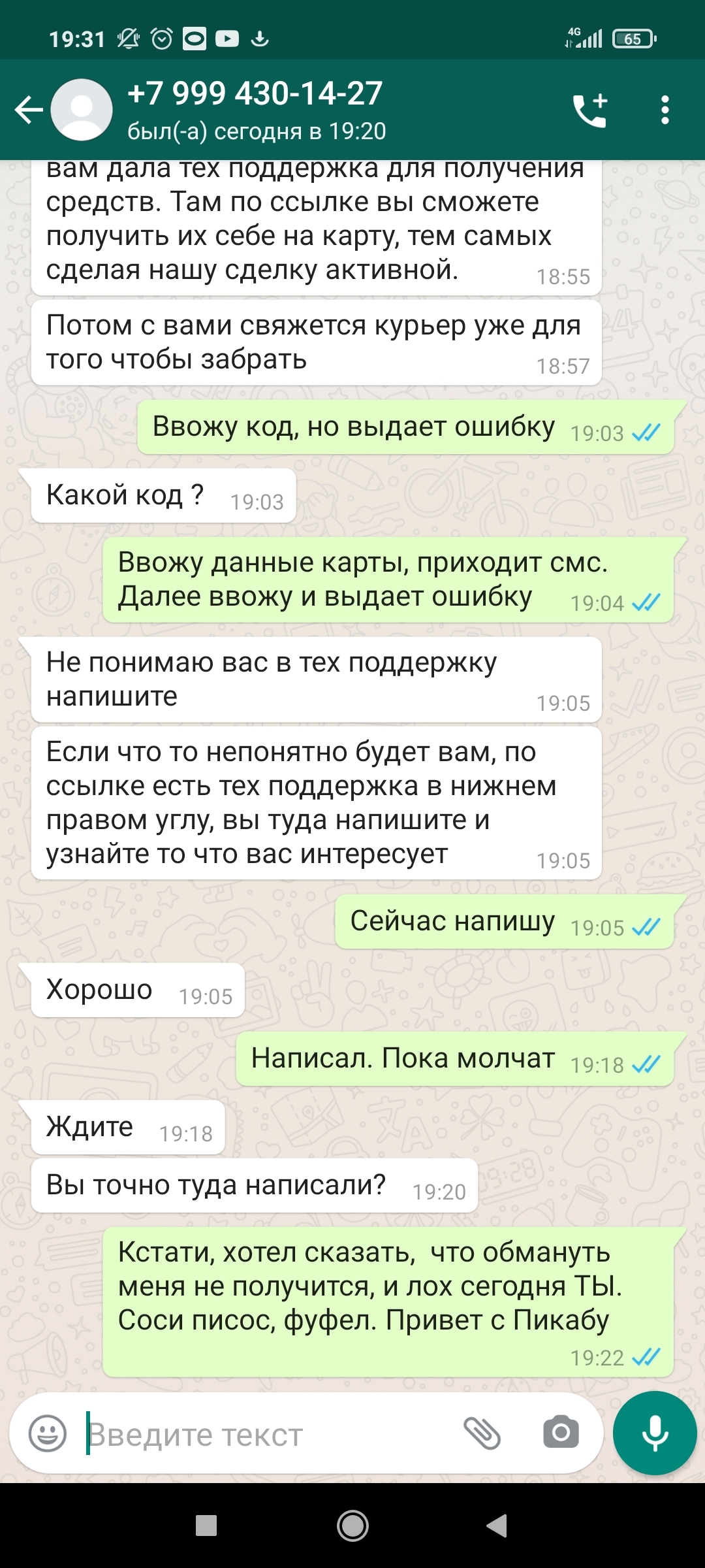 Спасибо Пикабу за просветительство. Благодаря данному сообществу, я думаю, многие люди смогли не попасться в лапы коварных разводил. Вот вам моя вчерашняя история. Продаю фотоаппарат на авито. Заинтересованных не было. Никто не писал и не звонил. И вдруг на ватсап прилетает сообщение.