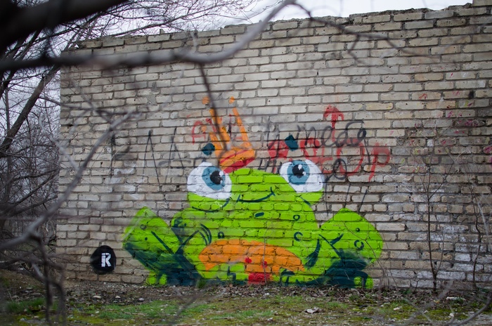 Царевна лягушка притаившаяся кустах. Рисовал ещё когда кусты не заросли зеленью. Потом лягушка будет в этой зелени сидеть. Но её к тому времени уже испортили. Это был мой первый нелегальный стрит-арт.