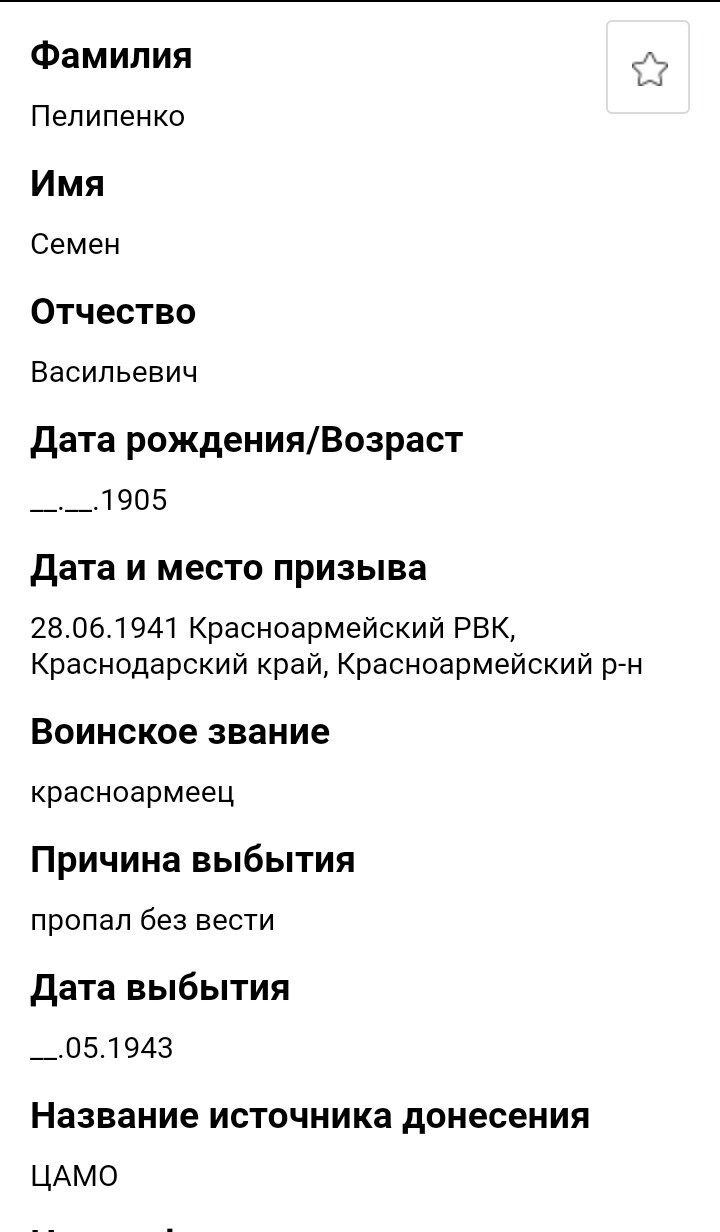 2972 VenikOo История Мой прадед1 2 года назад Пелипенко Семён Васильевич.Призван 28 июня 1941 года, пропал безвести в мае 1943 года, под г.Сумы. Вот и все, что известно о его боевом пути. Спасибо тебе, Семён Васильевич, за победу, я горжусь тобой. [моё] Великая Отечественная война Ветеран Великой Отечественной войны Бессмертный полк Длиннопост Ветераны 9 мая - День Победы 11 9 Ещё 0