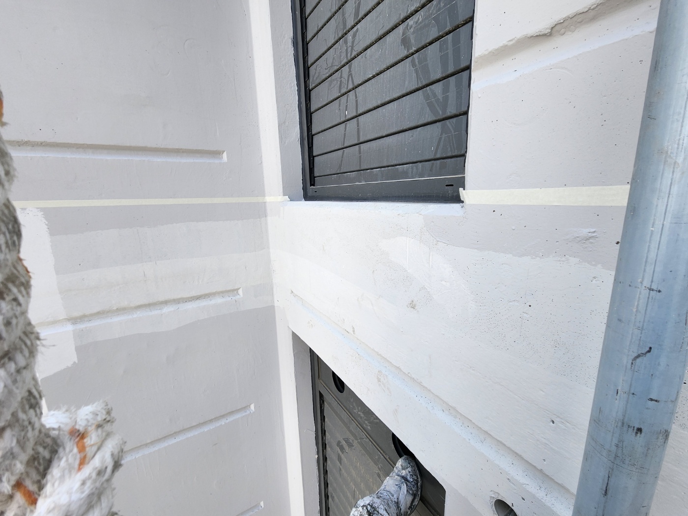 Вчера закатывал основной цвет. Сегодня рисую полоски. Обычно разные цвета стыкуются по канавкам. В этот раз не повезло, канавки в других местах, поэтому используем малярную ленту. Ее уйдет на этом объекте очень много. Полоски идут через этаж и заходят на откосы.