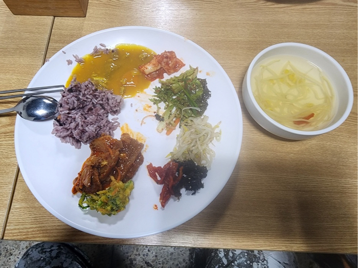Далее обед. Я вообще не ем, но в этот раз взял еды чтобы сфотографировать. Рис, кари, кимчи, салат из салата, проросший маш, неведомая еда, жаренные овощ в кляре и мясо в соусе. Суп из проросшего маша.