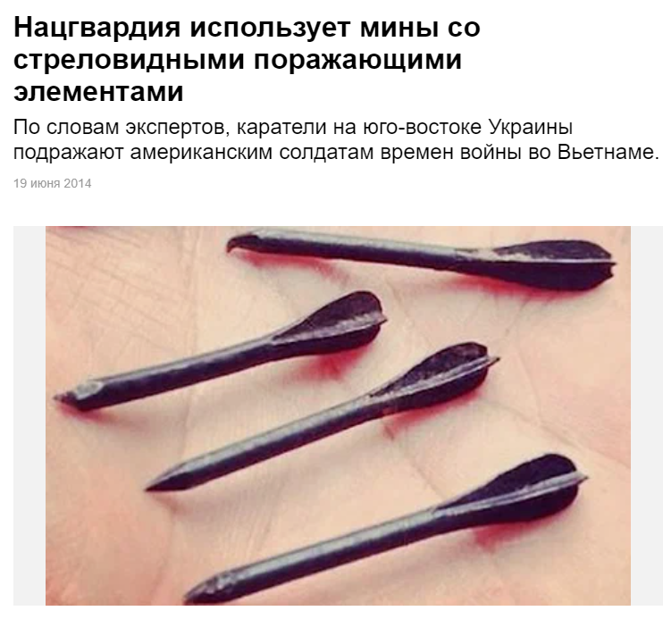 Перевод: Десятки жителей Бучи были убиты металлическими флэшеттами от снарядов русских орудий. На фотографии представлена сама флешетта - маленький металлический дротик, найденный в телах убитых. Для справки: вот статья о том, что конкретно это такое.