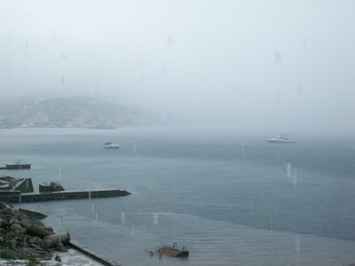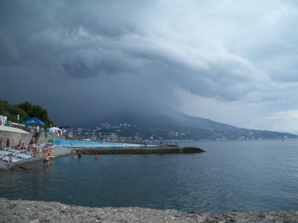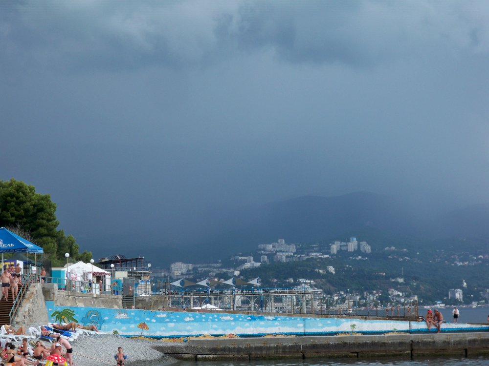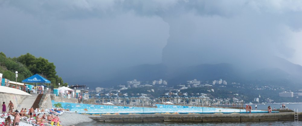 "Нахер" или не "нахер", я не знаю, но до Ялты таких потоков воды с неба не встречал, с дороги потоками воды некоторых сбивало с ног. Лил дождь часа 1,5 наверное