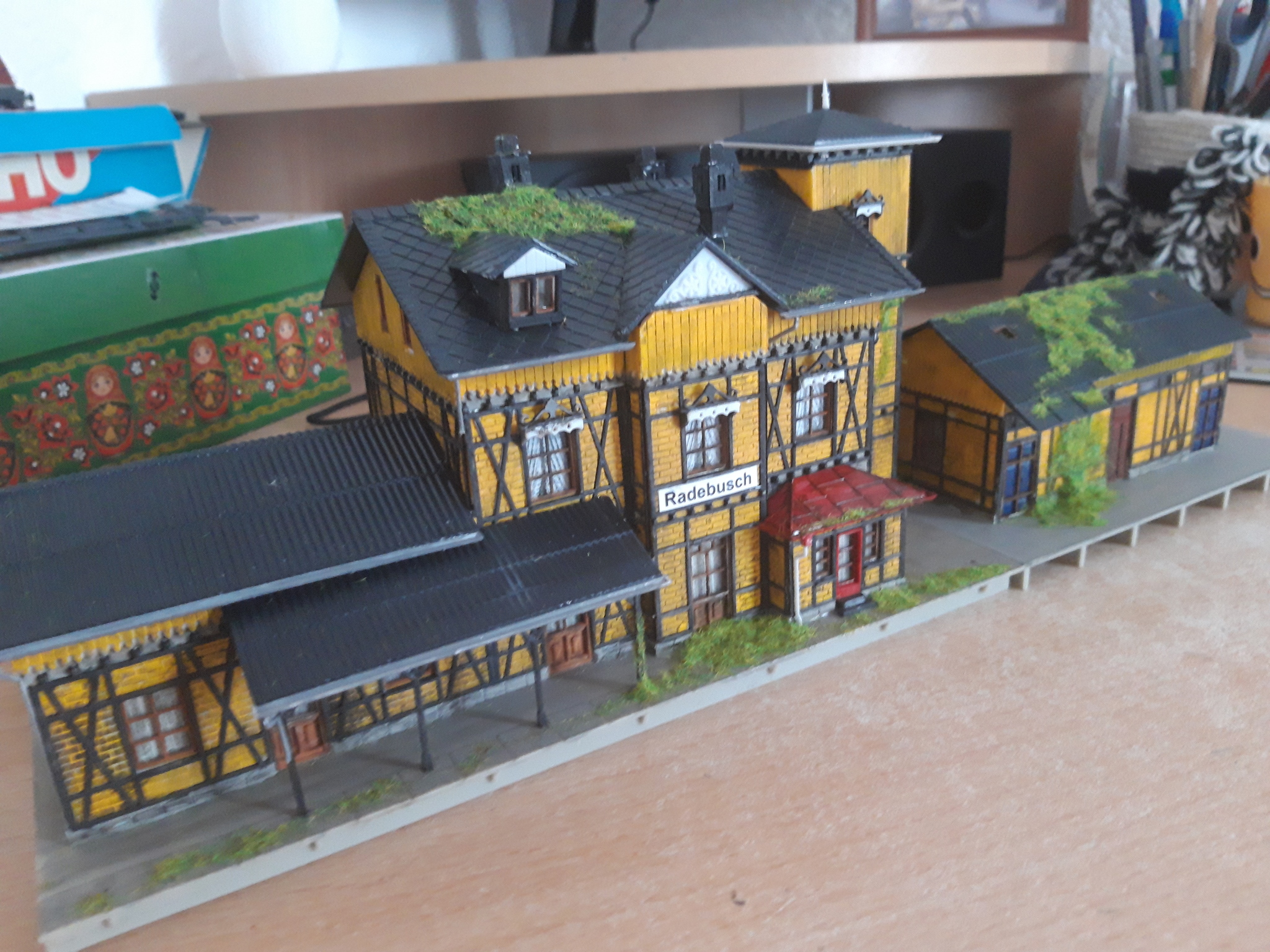 Еще продается от фирмы noch зелень. Ну или нарвать травки и порубить ее. И приклеить емли хотите сделать какие нибудь лианы, либо мох. Я так делал со своей станцией для жд.тоже делал черной краской щели, чтобы состарить. А так вы большая молодец, я бы такое не своял бы из картона. Не хватило бы терпения:)