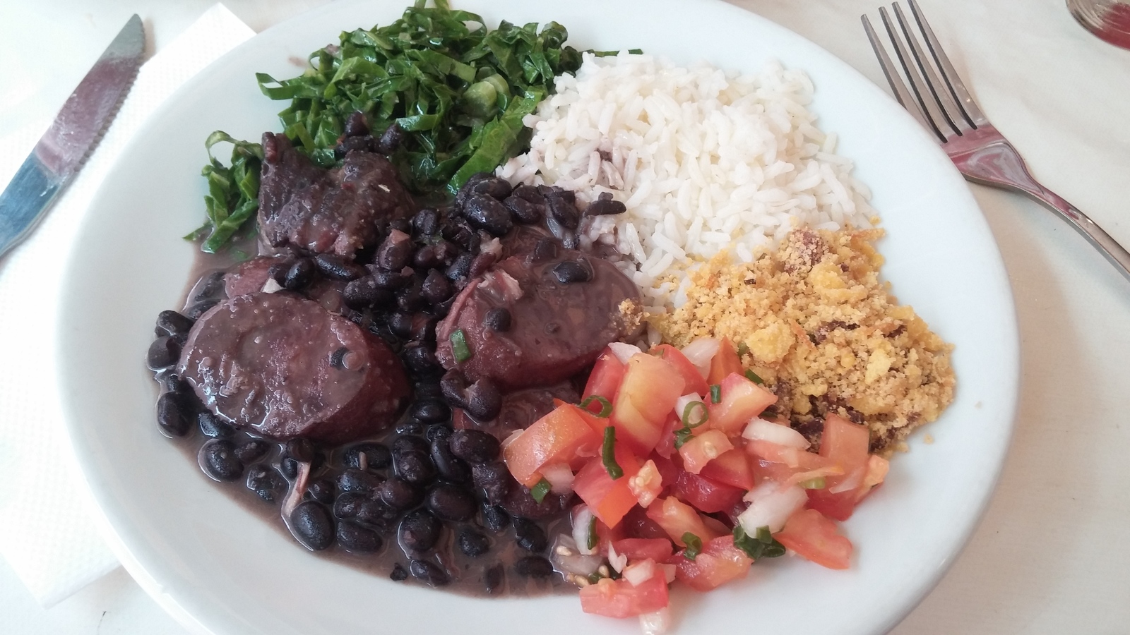 Фотки из инета (ну, нет у меня привычки фоткать еду, особенно повседневную. Вы же котлеты с гречкой не фоткаете?). Но примерно всё так это выглядело каждый день. Желтая рыхлая фигня на последнем фото — это фарофа. По-сути, высушенный маниок (популярный бразильский овощ (?), перетертый в крупную муку), который готовиться вместе с луком, колбасками, яйцом жареным и прочее. Об этом как-нибудь позже напишу. А вот другая зеленая фигня, это листья салата couve, по вкусу обычная трава, мне она не нравится даже сейчас, а бразильцы тащатся. Ну и, конечно же, vinagrete. Винегрет, да. Что, не видите его на фото? А винегрет по-бразильски это просто порубленные помидоры вместе со свежим репчатым луком с небольшим количеством уксуса и масла соевого. Вон, внизу красненькое такое на последнем фото. И фасоль, конечно же. Видов её здесь просто дофигища. Но готовиться она за одним принципом — сначала в скороварке на полчаса, а потом добавляют специи в самом конце. Кушается это всё вместе с водой, в котором готовилась фасоль, которая уже превратилась в этакий полугустой соус. В Украине я фасоль практически не ела, поэтому в Бразилии очень долгое время её тоже избегала. Но потом, спустя год моего жития здесь, я прониклась. Теперь я обожаю фасоль! Особенно черную. У нее просто потрясающий аромат и вкус, а если готовить вместе с копчеными колбасками calabresa — выходит просто мега вкусно! И калорийно, но сытно) Часто готовлю просто фасоль в бульоне вместе с колбасками и картофелем (лайт-версия фейжоады, национального блюда Бразилии) и потом со свежим хлебушкем… Боже, полночь, а у меня слюни текут, пока это пишу.