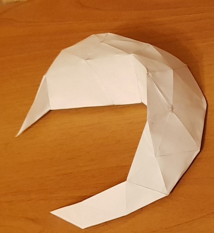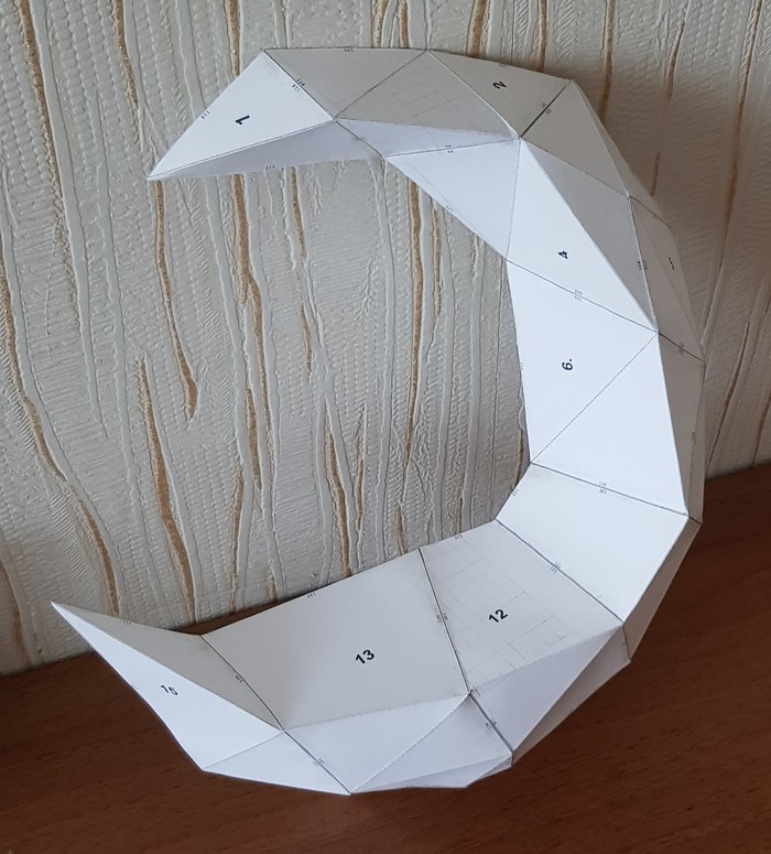 Месяц готов. Получился в зеркальном отображении, потому что склеивал номерами вверх. Так показалось удобнее клеить, и модель сама больше нравится в таком варианте.