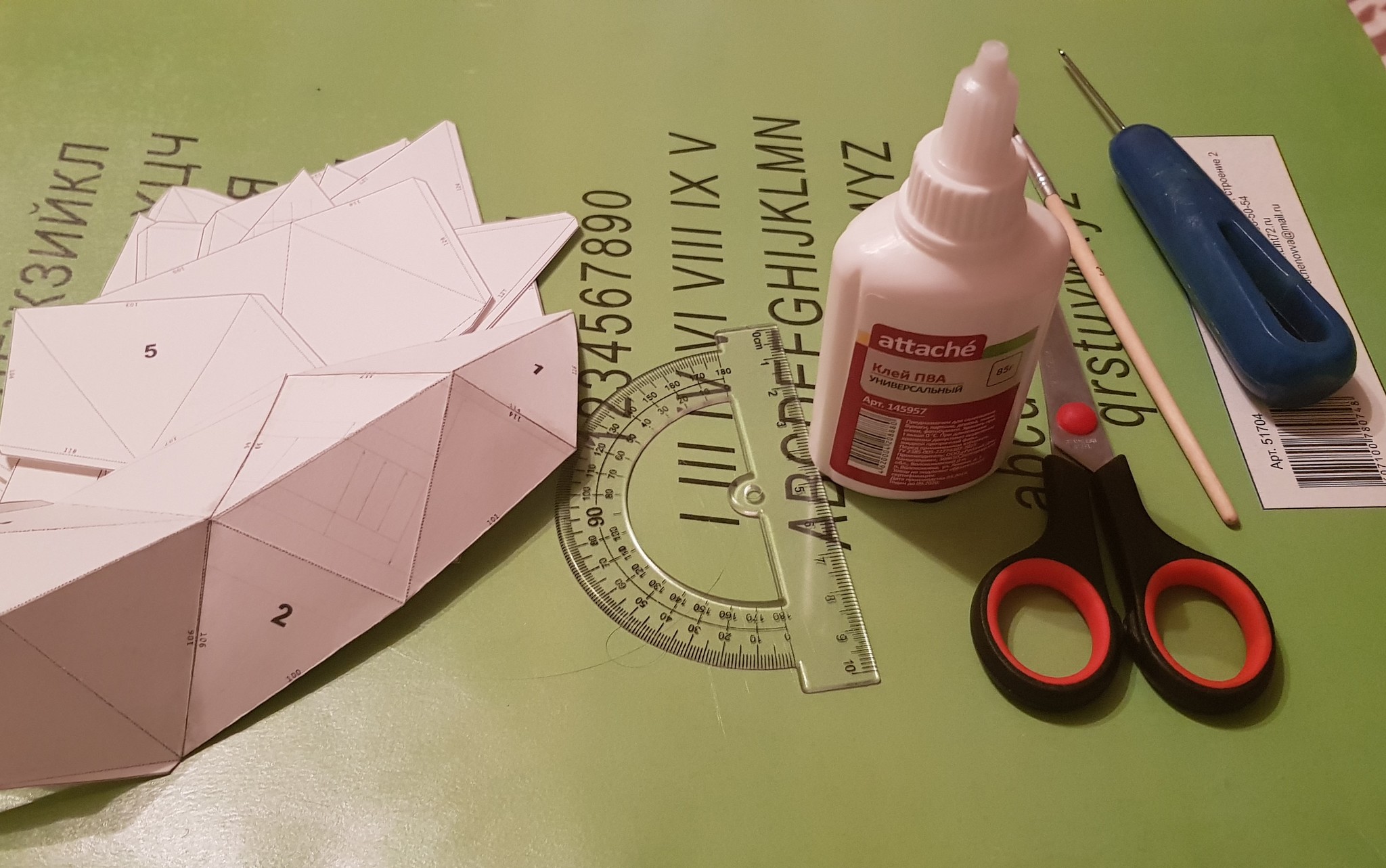 Тогда в ход пошла бумага для черчения. Не спрашивайте откуда она взялась, я сам не знаю. Просто лежала. Здесь добавились линейка и шило, ими проводил по контурам плотной бумаги, чтобы легче было согнуть. Масштаб при печати немного увеличил.