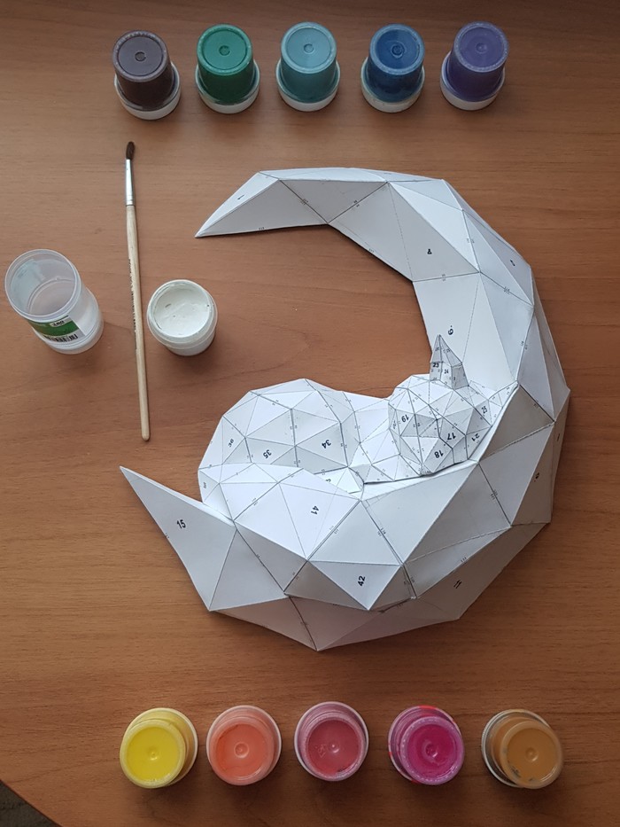 Начал поиски материала в доме. Нашёл. Офисная бумага, клей ПВА и ножницы. Это сейчас я за такое сам себя бы казнил, а тогда был полон уверенности, что всё получится. В качестве модели была выбрана лиса на луне.