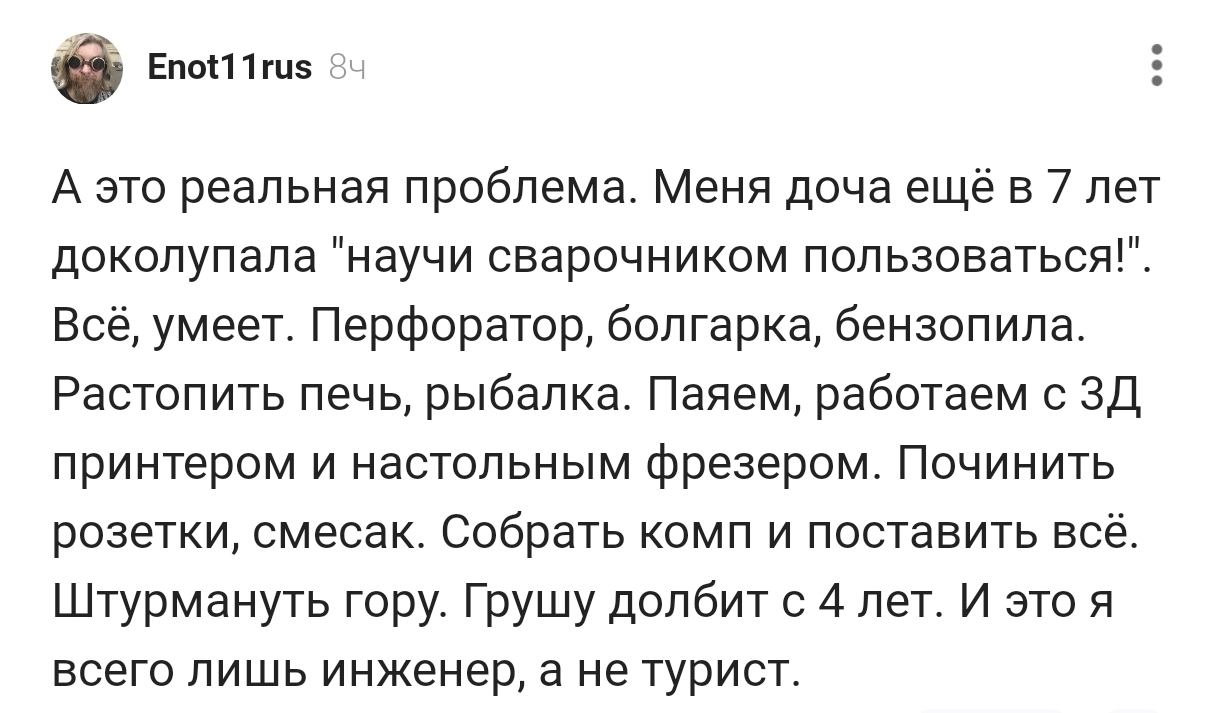 Моя дочь умеет всё - включая перф,болгарка,бензопила,рыбалка   и т.д