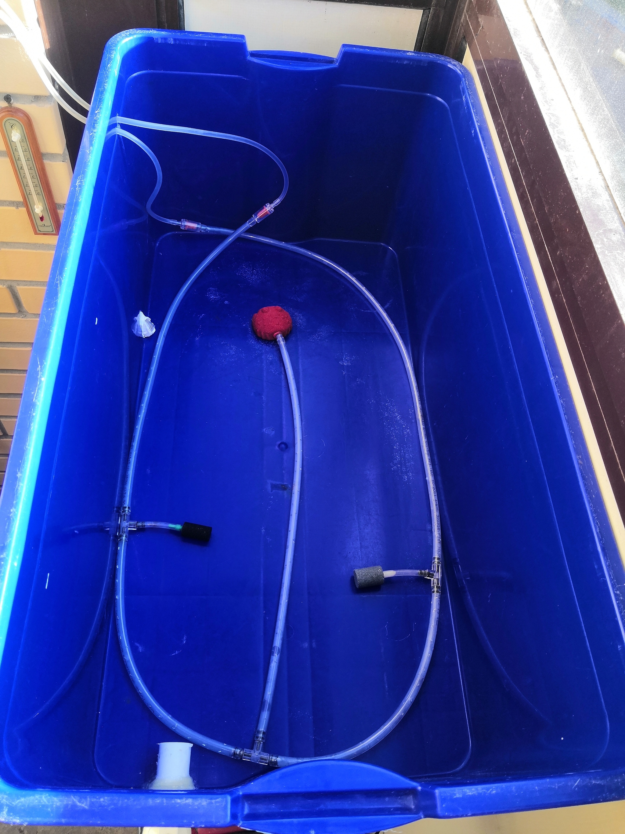 08.05.2021 потеплело, 09.05.2021 вообще тепло, и решил уже запускать установку. Вода уже 2 дня как набрана, отстоялась, хлор лишний испарила. В качестве распылителя я использовал трубку силиконовую 6 мм с отверстиями натыканными шилом, но, как показал опыт, отверстия со временем схлопываются и воздух практически в рассол не поступает. В конце прошлого сезона установка доживала с полностью схлопнутыми отверстиями шланга и одном сером камне (на фото - справа) и в принципе его вполне хватало, растишки чувствовали себя норм, корни все белые, рассол не «зацвел» Решено добавить парочку камней через тройники.