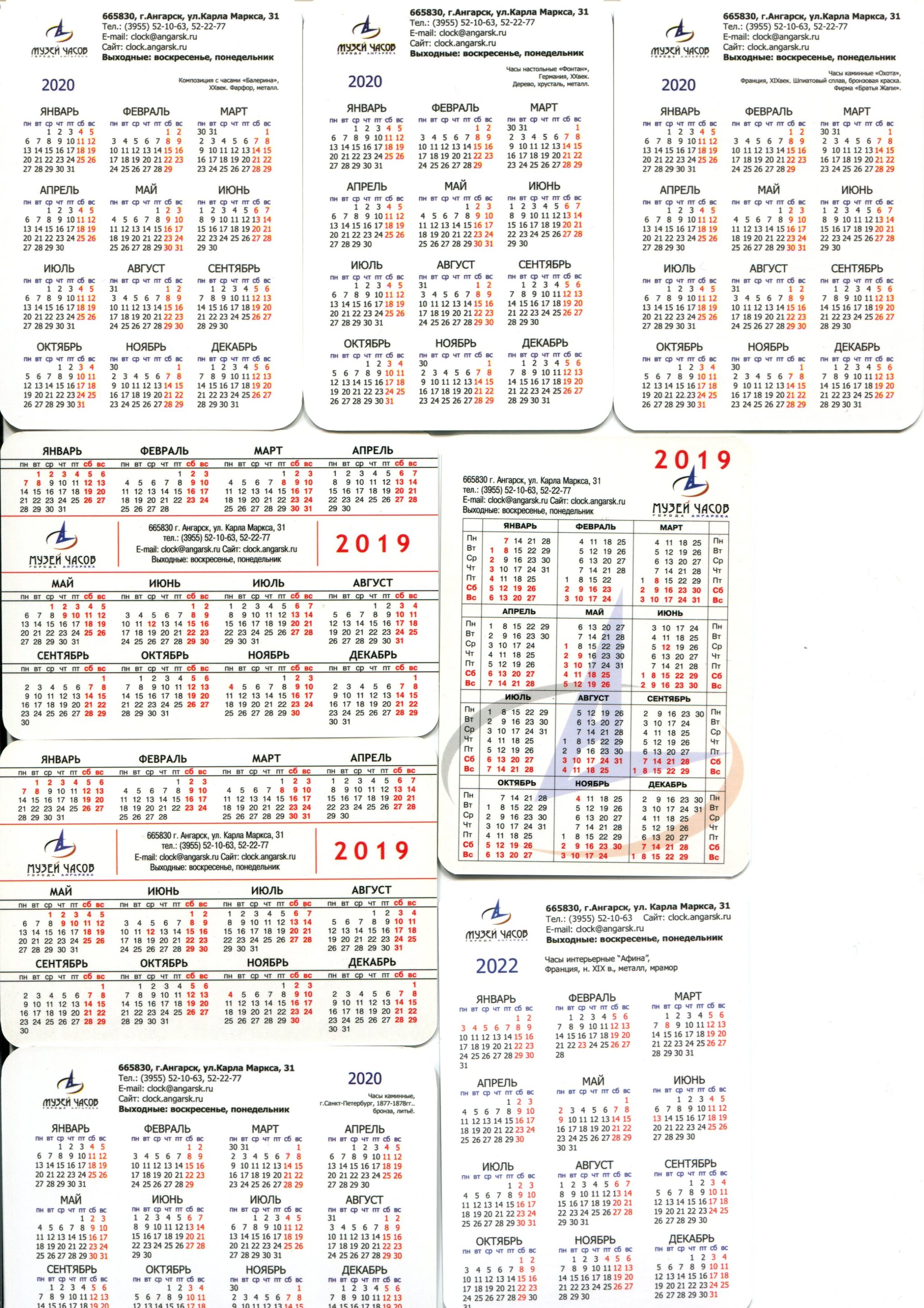 Здесь показаны календари, выпущенные Музеем часов города Ангарска с 2019 по 2022 год.