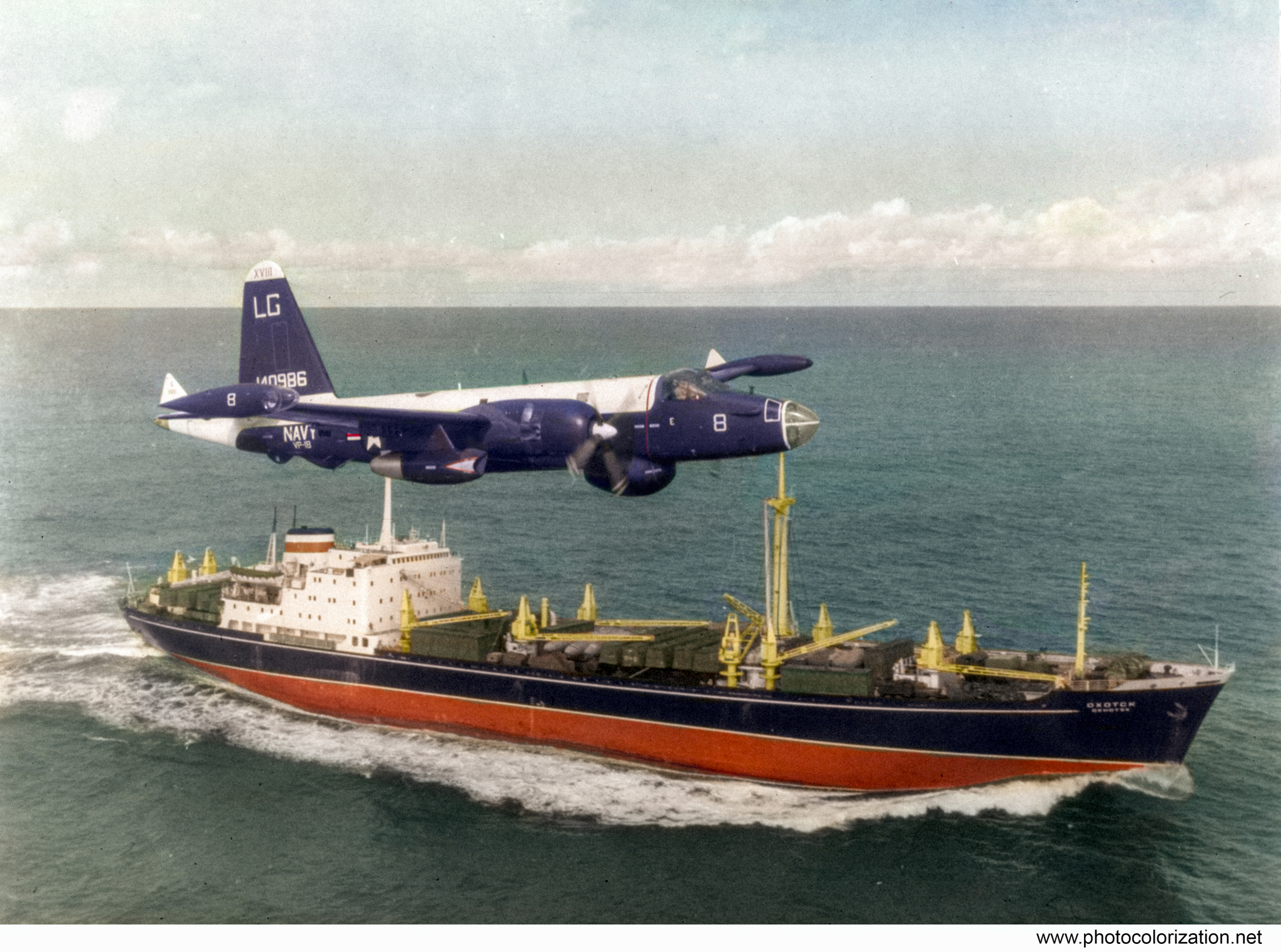 47 kostas26 Моя колоризация. 6 лет назад Операция "Анадырь". Американский патрульный самолет P2V Neptune сопровождает советское грузовое судно во время кубинского ракетного кризиса. 1962 год Оригинал [моё] Колоризация Холодная война Карибский кризис