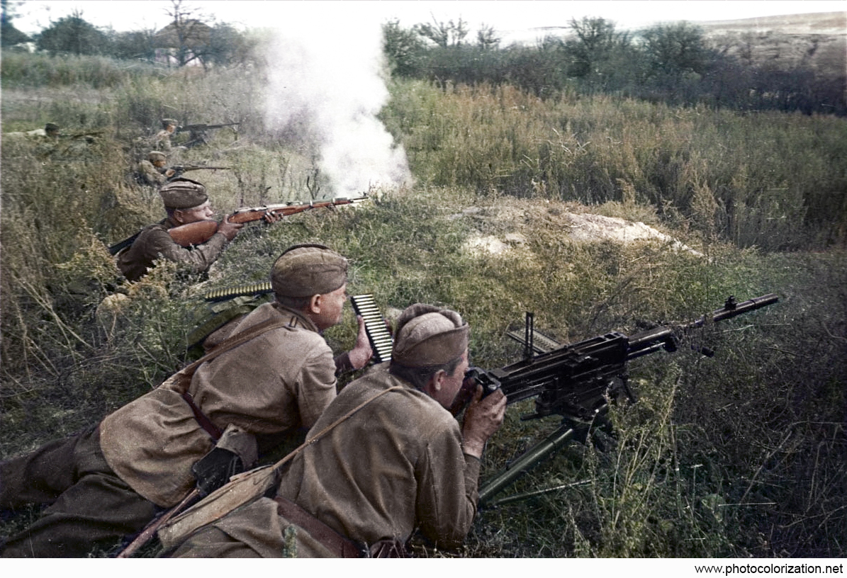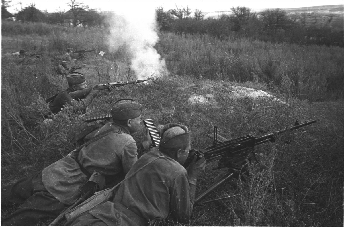 Советские пулеметчики ведут огонь из трофейного итальянского 8-мм пулемёта Breda Mod.37