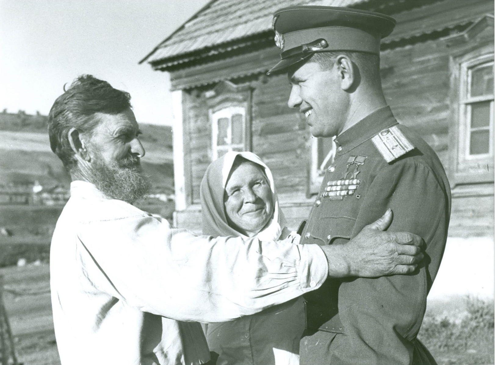 Дважды Герой Советского Союза, летчик-истребитель Николай Скоморохов после возвращения в родное село Лапоть Саратовской области. 1946 год