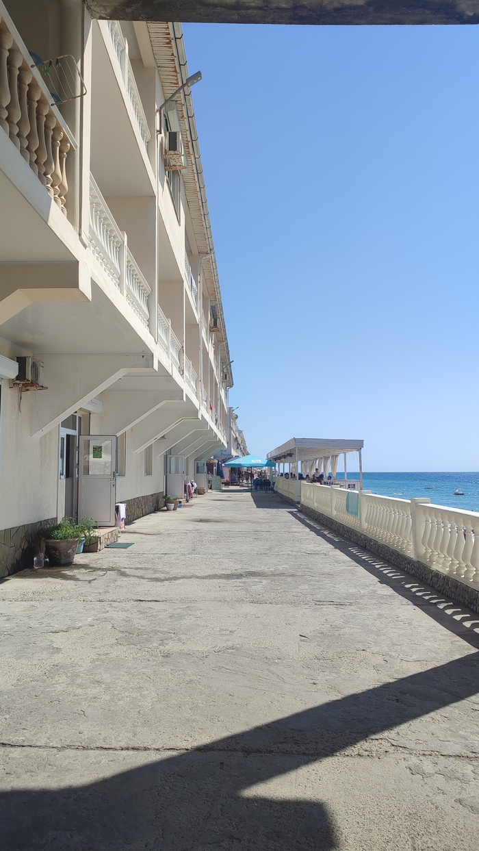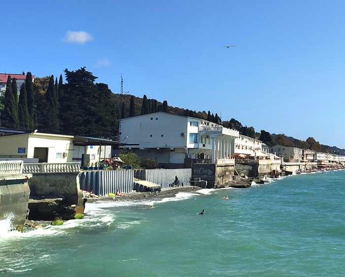 Кстати, в Лоо меня очень сильно удивила плотность прибрежных жилых построек. Некоторые мини гостиницы находились от пляжа буквально в 10ти метрах. Из-за нагромождения бетонных конструкций и обилия человейников, часть набережной пришла в негодность, была оцеплена со всевозможных сторон и потихоньку съезжала в море. Я предполагаю, что это произошло из-за подмыва фундамента штормовыми волнами. В некоторых местах променад уже обрушился в море. Выглядело это максимально жутко. Особенно запомнилась гостиница без пляжа как такового, в которой балкон прикрепленный на сваях к 3 этажу уже накоренился и было ощущение, что он вот вот рухнет. И буквально в 50 метрах слева обрушившаяся в море часть набережной, а между этими постройками - скудный кусок пляжа и люди купающиеся в море. Честно, не понимаю как в таких условиях отдыхали люди и как им было не страшно купаться под балконами, которые могут рухнуть в воду в любой момент. Вот вам фотография, наглядно демонстрирующая в каком аварийном состоянии находится набережная Лоо, которую и набережной то назвать нельзя. В идеале было бы неплохо все эти человейники снести и оборудовать безопасную береговую зону. Но видимо жажда наживы на отдыхающих побеждает здравый смысл. Мой личный совет не отдыхать там. Я не спорю, что скорее всего в Лоо есть хорошие пляжи с адекватным и безопасным спуском к воде, но то что я увидела своими глазами - не поддается никакой логике.