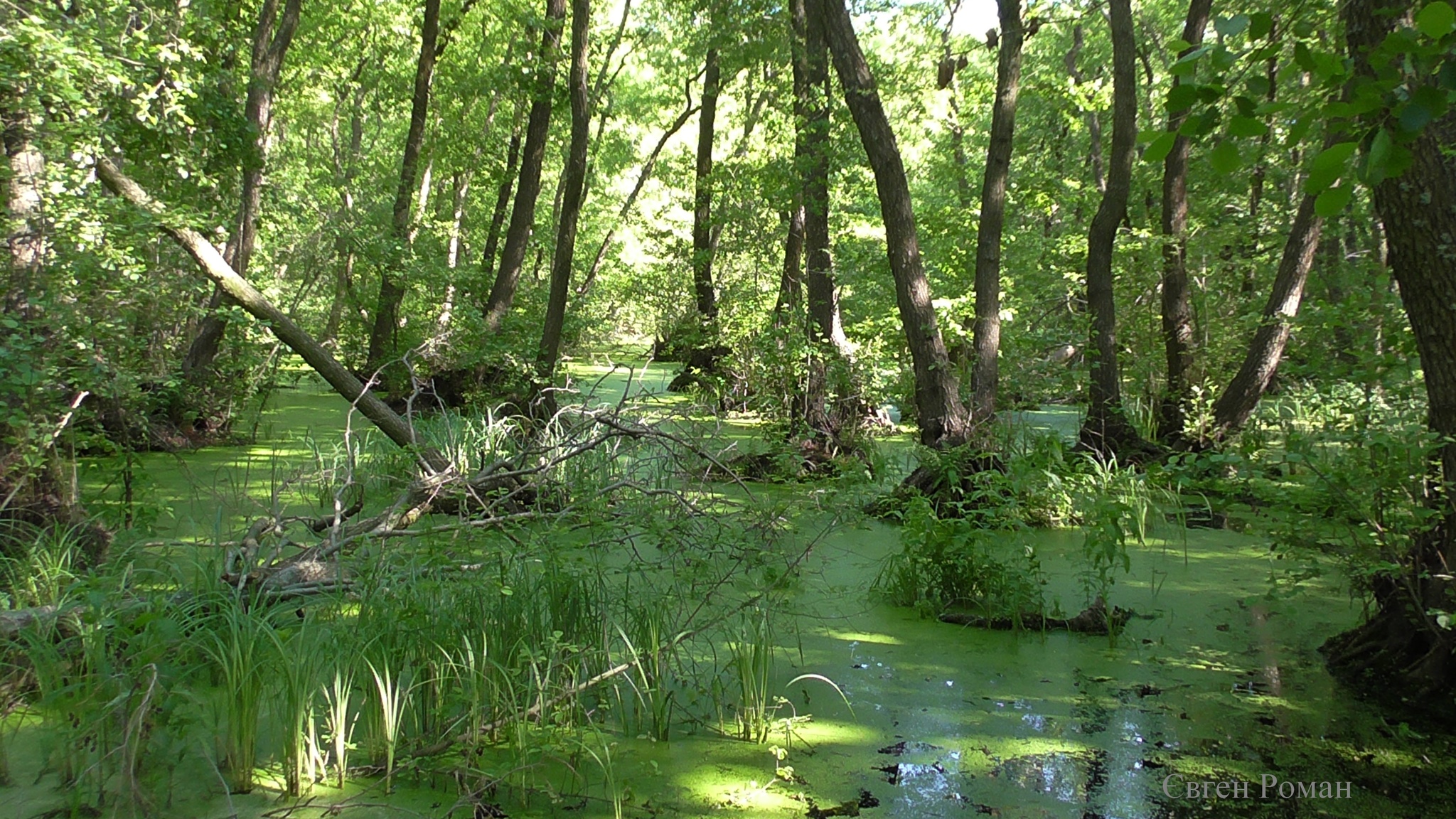 Эверглейдс? Нет! Это Ковалёвская Сага - остатки реликтового леса на Кинбурнской косе. Это место воспето Геродотом как Гилея - страна лесов. Состоит этот лес из ольхи, тополей и сосен. Иногда тут растут дикие груши и яблони. Это фото сделано в болотистой части урочища. Некоторые озёра тут образованы подземными источниками, и настолько чистые, что тут живёт форель.