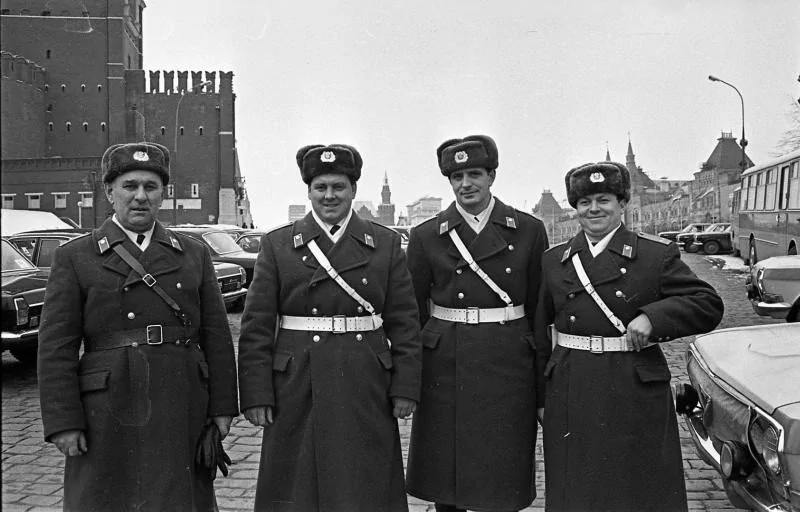 Милиционеры с дружинниками патрулируют улицу, 1980-е. Странно, что рация "Виола" висит на дружиннике (посередине). Да и форма у милиционеров не для патрулирования: брюки с туфлями вместо галифе и сапог с портупеей. Возможно - участковые, но у них при себе почему-то нет папок с материалами или полевых сумок.