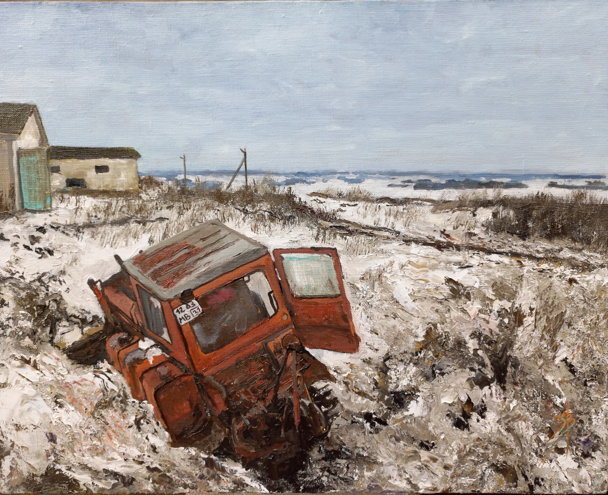 Просто трактор бороздит окрестности, прокладывает путь к своему обиталищу , нет никакой смысловой нагрузки, пауза из простой жизни , возможно для кого-то очень близкой или напротив далёкой, но тем не менее это есть .