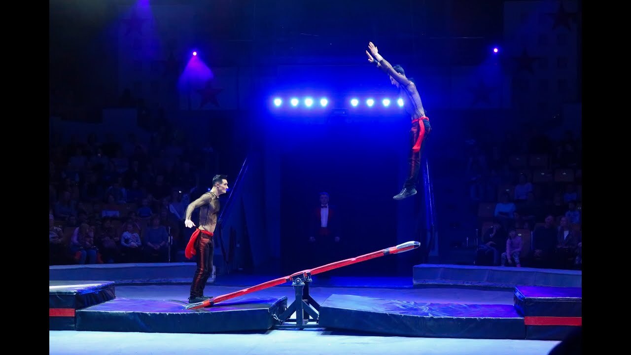 2. Вылет с цирковой подкидной доски – это когда ты стоишь на одной ее стороне, а твой партнер напрыгивает на другую сторону, чтобы твоя подкинула тебя вверх. Как по мне, вылет получился красиво. И вот этот трюк на месте оказался чуть сложнее, чем на тренировке.
