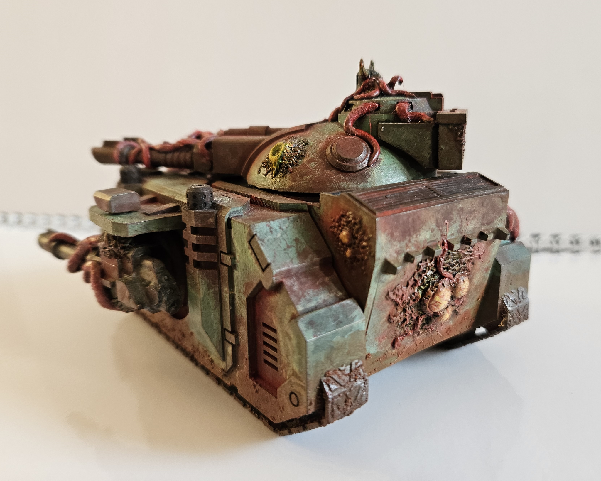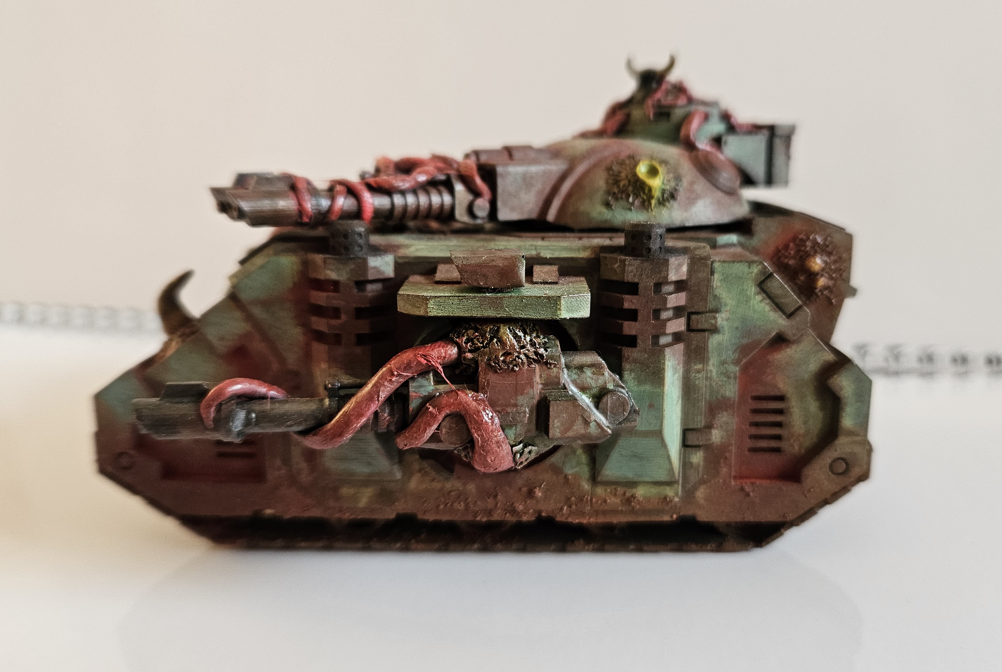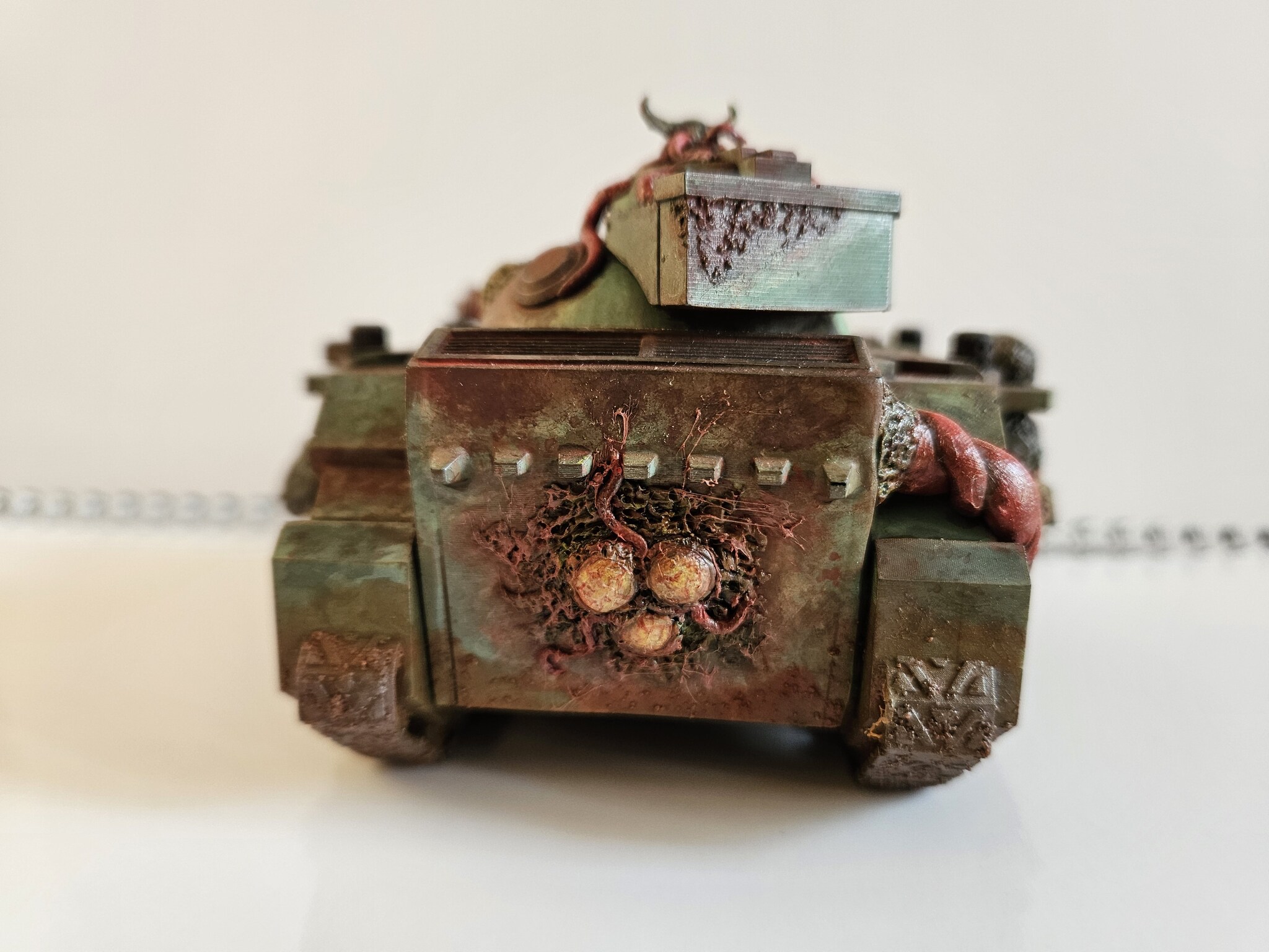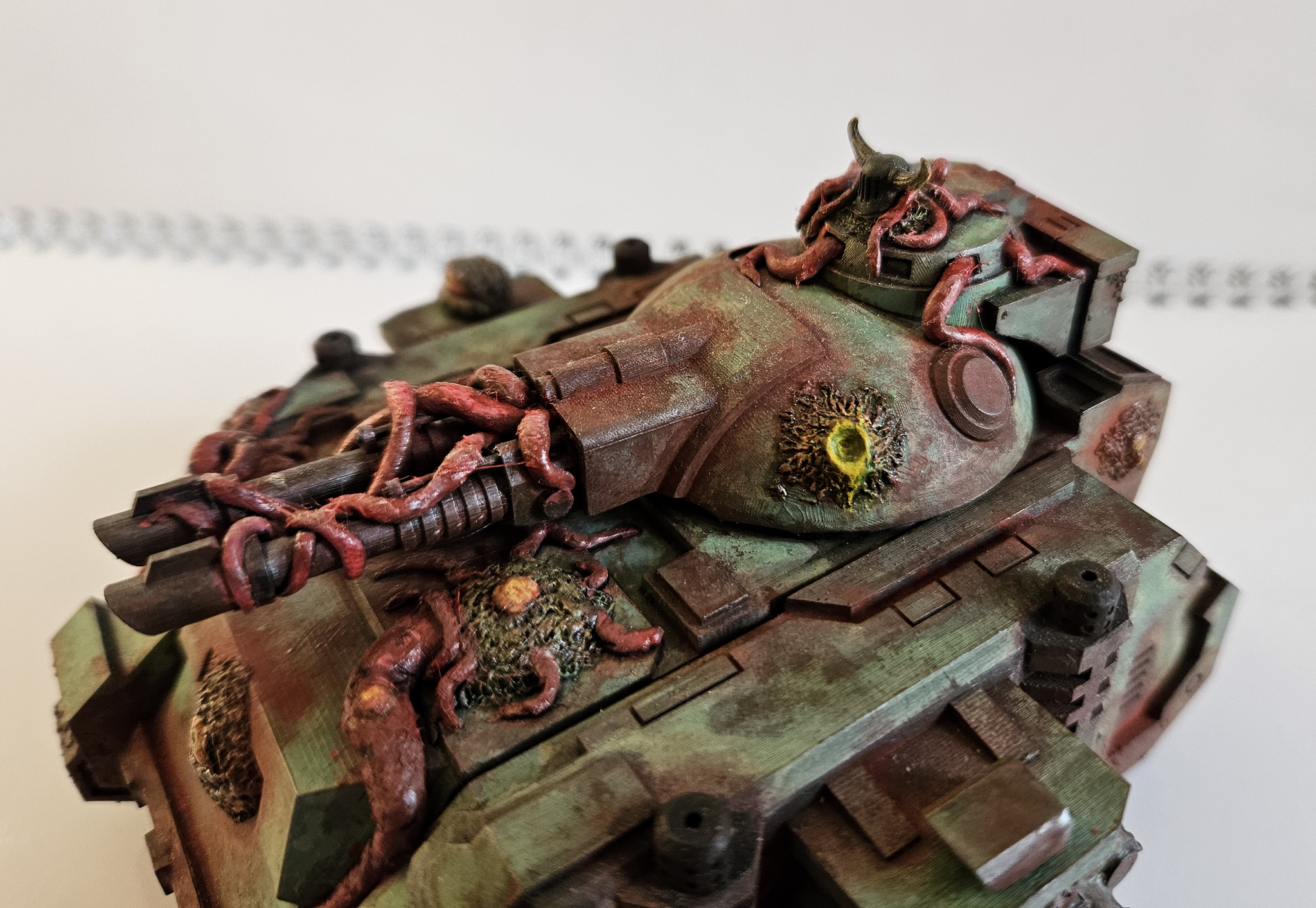 Процесс осквернения мне очень понравился. Башня, как Вы заметили, снимается, спонсоны подвижны, но вот оружие на танке не поменять. С зеленкой работать довольно интересно, правда несколько раз мой стул раскалялся, когда я делая щупальцы и нарывы с одной стороны, незаметно для себя раздавливал уже готовые щупальцы с другой стороны. Также во время покраса, как обычно, не обошлось без мучительных попыток подобрать нужный оттенок, особенно для плоти и нарывов. Для создания эффекта слизи я смешал прозрачный ПВА и краску. Требуемый эффект я получил, но этот способ мне не понравился, буду искать другие. А еще я, возможно, пиздец как увлекся ржавым пигментом. В общем, присутствуют ошибки новичка.
