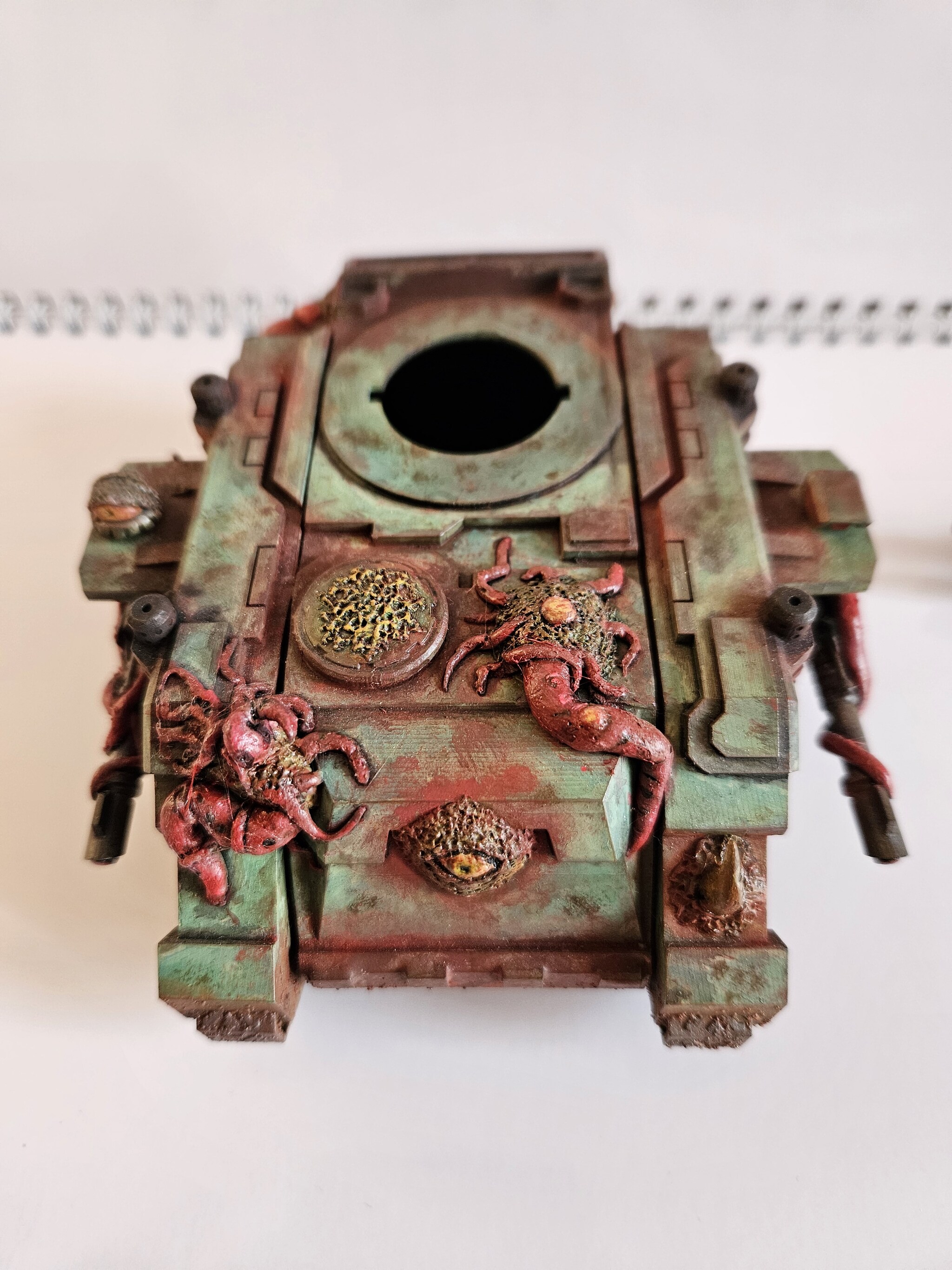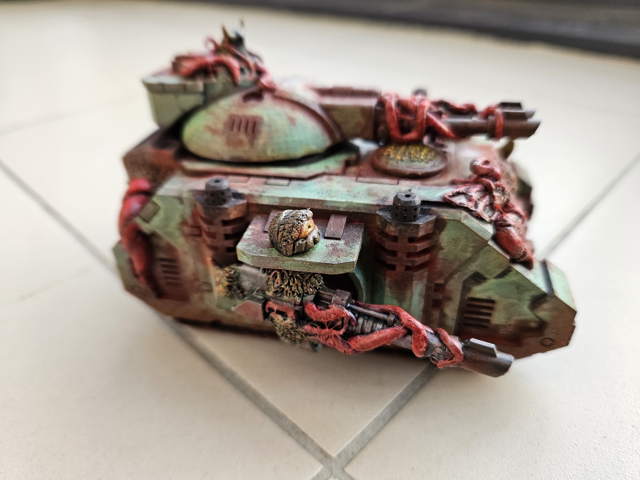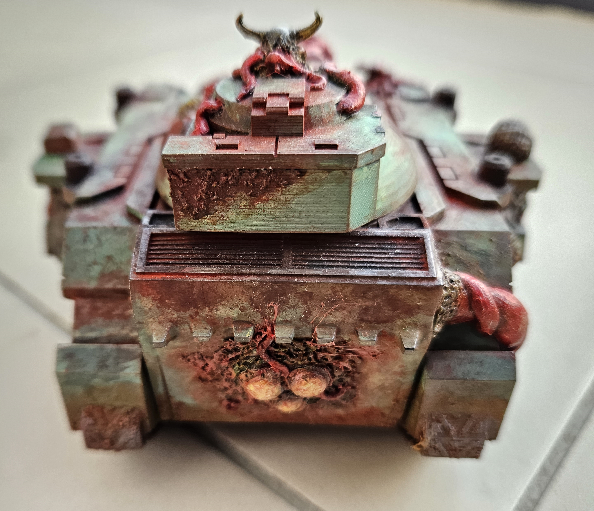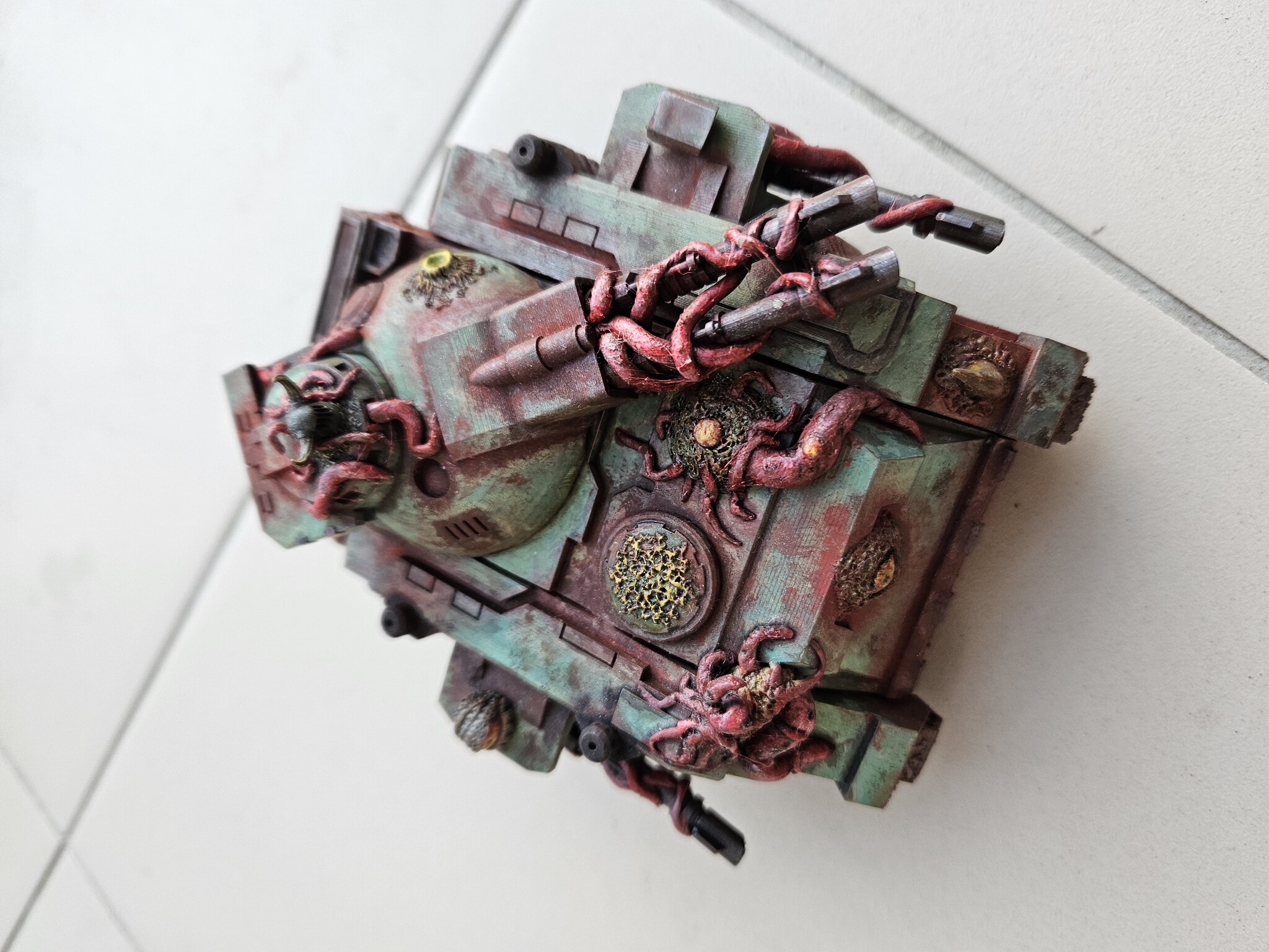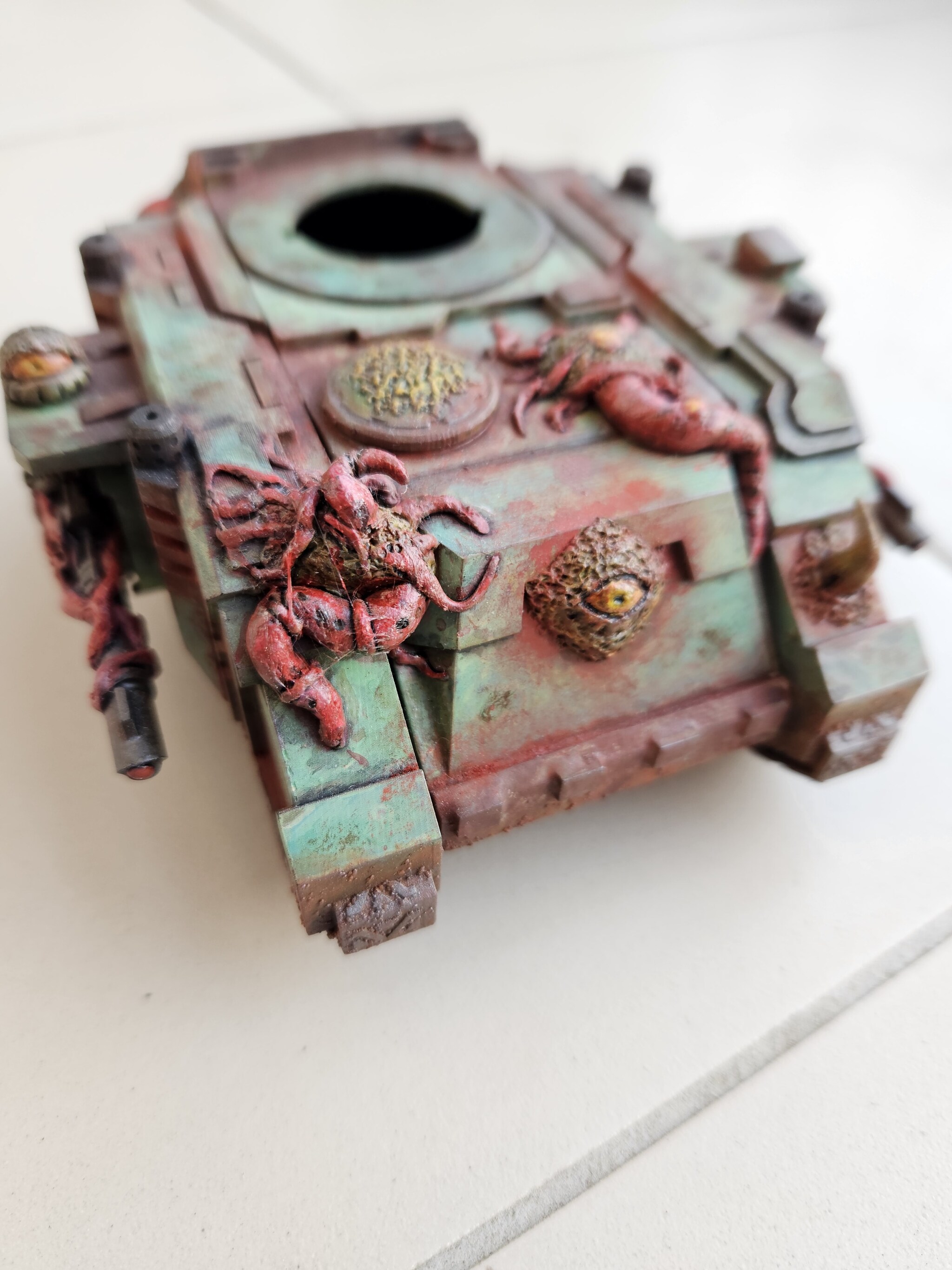 Процесс осквернения мне очень понравился. Башня, как Вы заметили, снимается, спонсоны подвижны, но вот оружие на танке не поменять. С зеленкой работать довольно интересно, правда несколько раз мой стул раскалялся, когда я делая щупальцы и нарывы с одной стороны, незаметно для себя раздавливал уже готовые щупальцы с другой стороны. Также во время покраса, как обычно, не обошлось без мучительных попыток подобрать нужный оттенок, особенно для плоти и нарывов. Для создания эффекта слизи я смешал прозрачный ПВА и краску. Требуемый эффект я получил, но этот способ мне не понравился, буду искать другие. А еще я, возможно, пиздец как увлекся ржавым пигментом. В общем, присутствуют ошибки новичка.