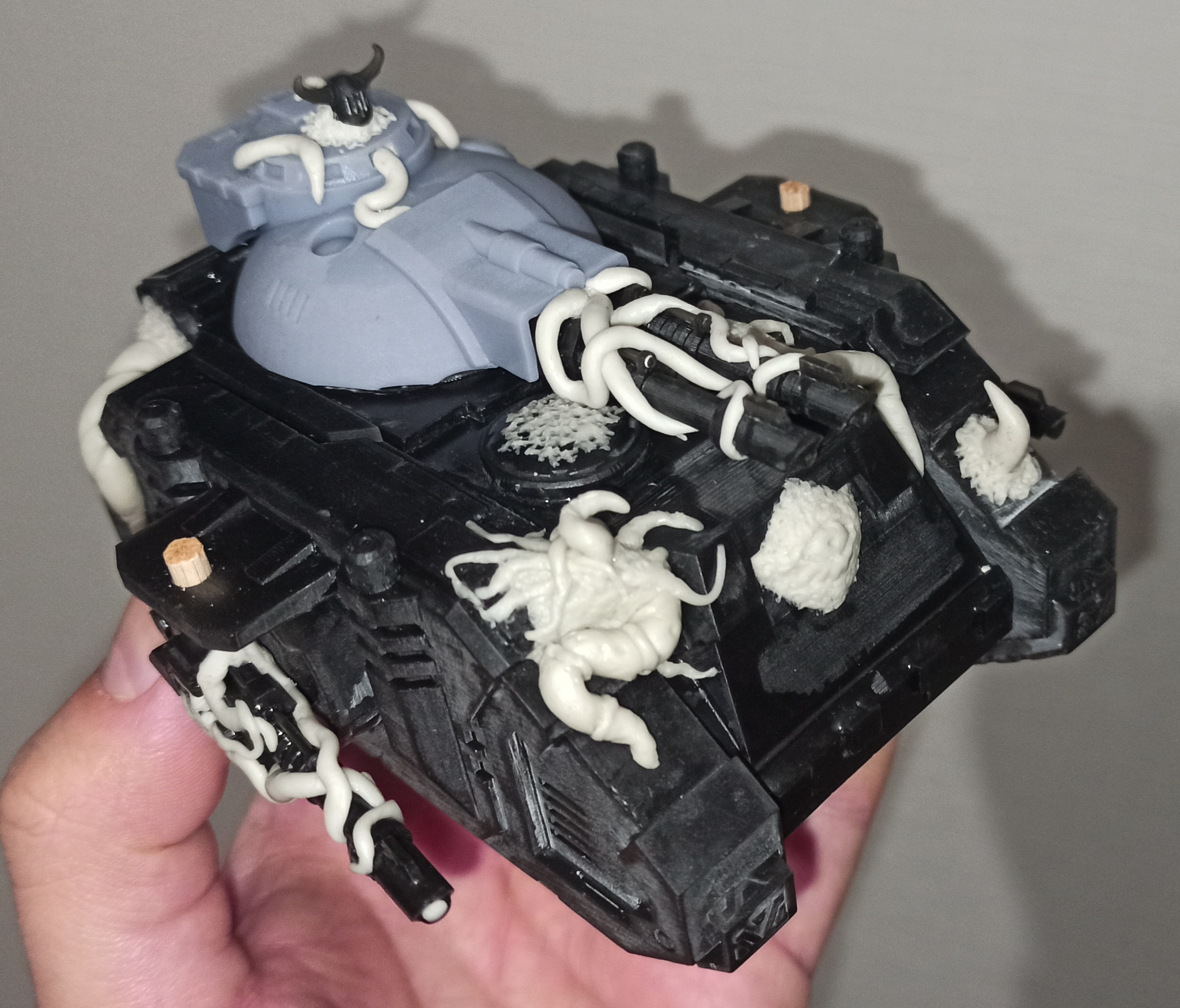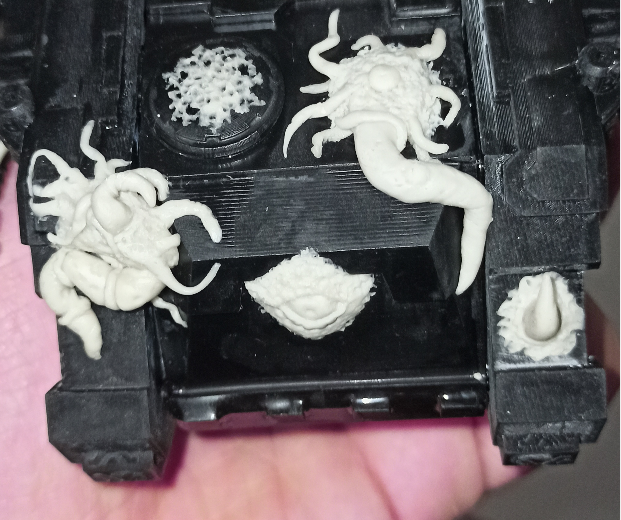 Получив заказ, я начал ощущать зуд в руках, который отправил меня к заветной коробке в поисках жертвы. Я должен был опробовать все, что заказал у торговцев. Вскрыв склеп дефектной печати, где покоились останки техники, я начал жадно перебирать руками заброшенные куски пластика и смолы. Порой мне попадались слоистые очертания техники из древних времен, когда у меня был FDM принтер. Вскоре я нашел свою жертву. Часть деталей была безвозвратно утеряна, а башню я ему так и не напечатал, но этого было более чем достаточно для моего ритуала. Недолго думая, я решил преподнести эту жертву Повелителю Разложения.