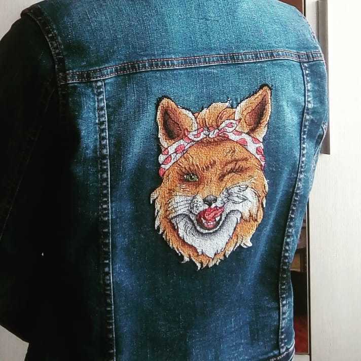 Лисичка продавалась в наборе, где было все для работы: нитки, водоростворимая канва, иголка, схема. Изначально я хотела её вышить на однотонной футболке. Идею с джинсовкой подсказал мой благоверный.