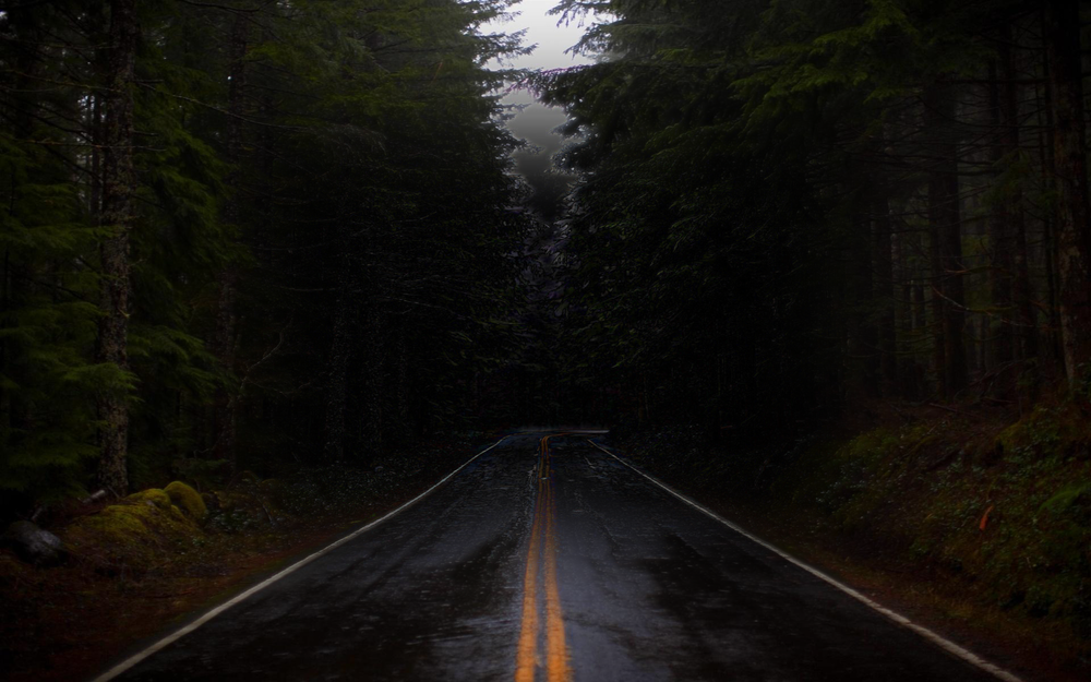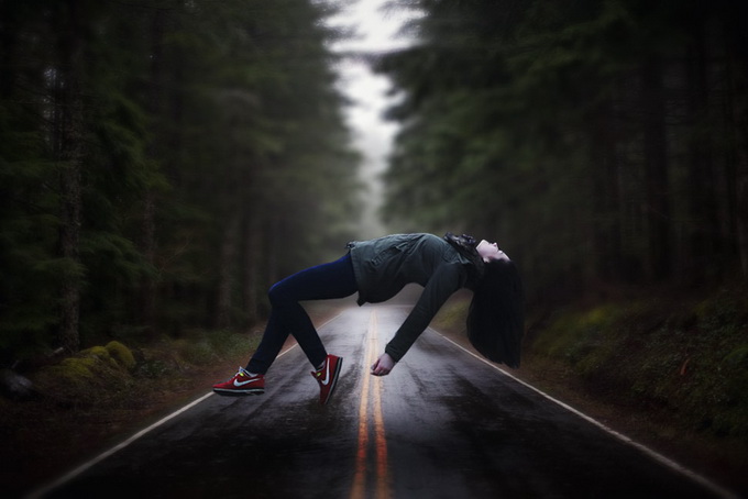 Я так понимаю, что место на асфальте, НАД которым находится барышня, тут за кадром. Дорога же широкая довольно, девушка в лучшем случае одну полосу поперёк займёт, а тут аж на две. Значит, точка ниже расположена. Поэтому не факт, что в кадре обязательно должно находиться пространство в фокусе, оно вполне может быть "за кадром". Плюс малая глубина резкости. В общем, мне кажется, тут наоборот всё ок. Атмосферно. А по поводу крипоты -- т.е. девушка, летающая над асфальтом в лесу, это не крипово само по себе?)