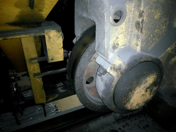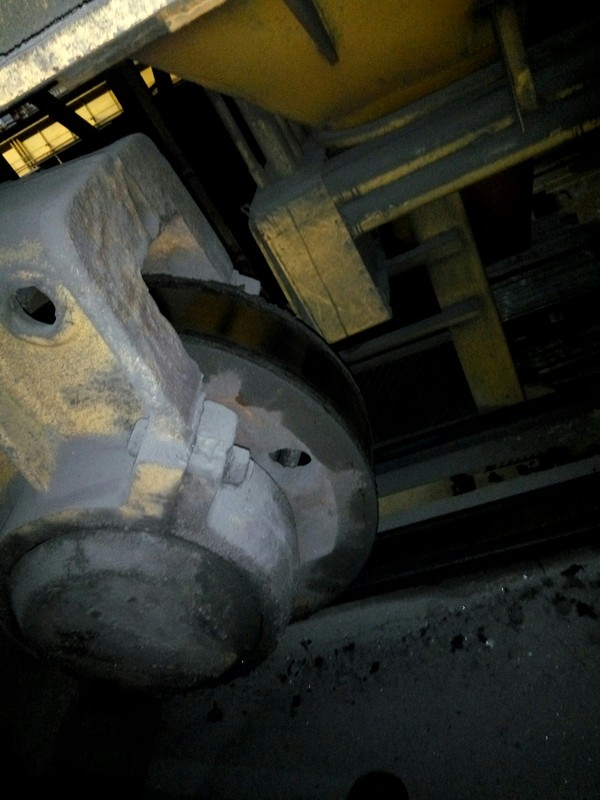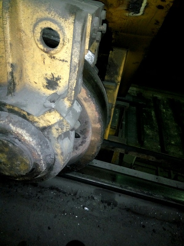 Я не знаток кранов, настроить тормоза, заменить канат, что то ещё сделать оперативно я могу. Чертежей не видел. Но вопрос? Сколько ходовых и холостых колес должно быть с ребордами? Все 8? Или 4 с одной стороны? Но я могу показать сколько колес с ребордами у нас, на первом кране 2 по диагонали, на 2 кране 3 так же по диагонали. И так считаем) тут 3 колеса с ребордами. И мы прекрасно видим что реборды просто отломлены.