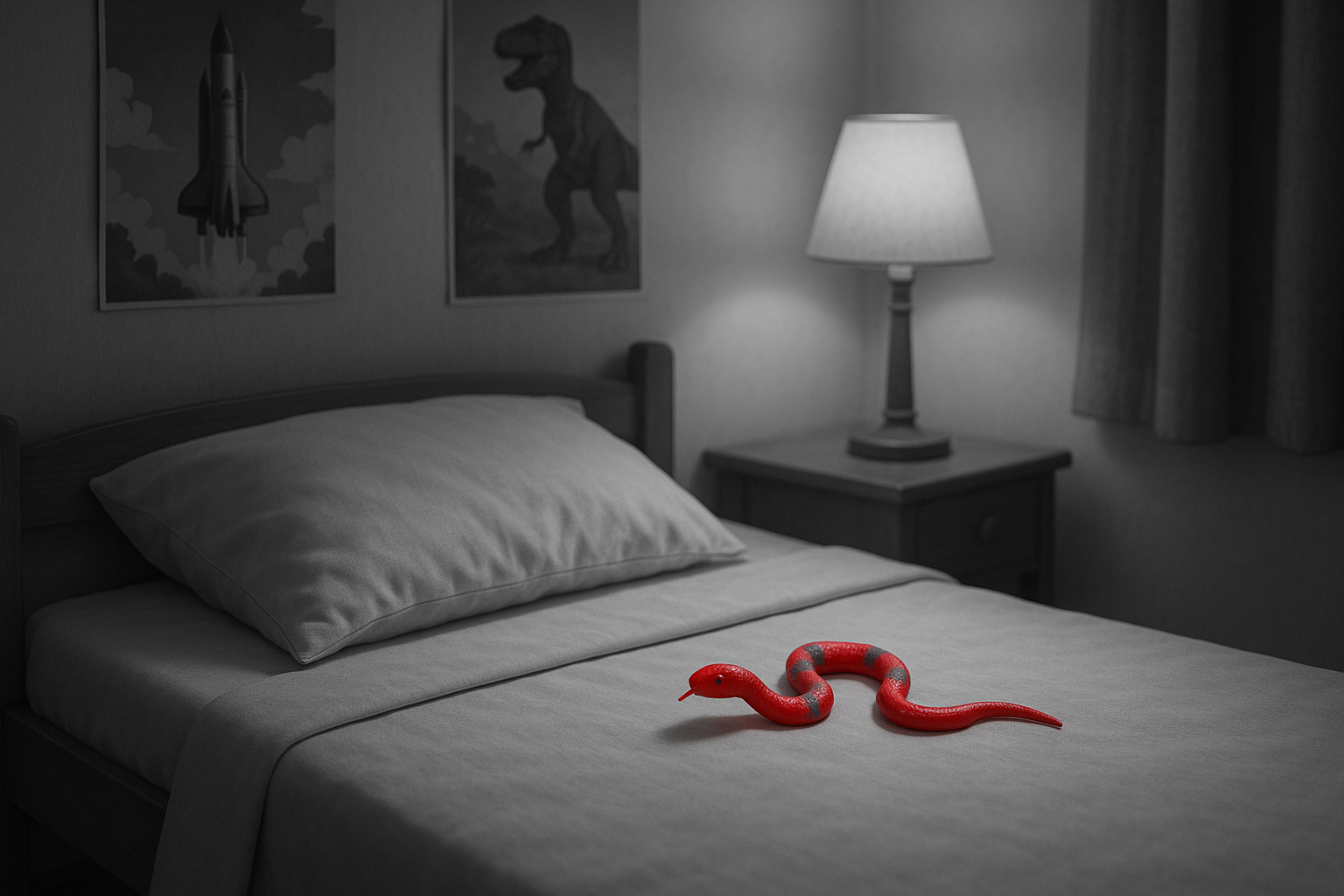 За её криком повисла тишина, показавшаяся вечной. Потом вбежали родители. Они увидели её — рот всё ещё прикрыт руками, глаза расширены от ужаса, а на кровати лежит игрушечная змея.