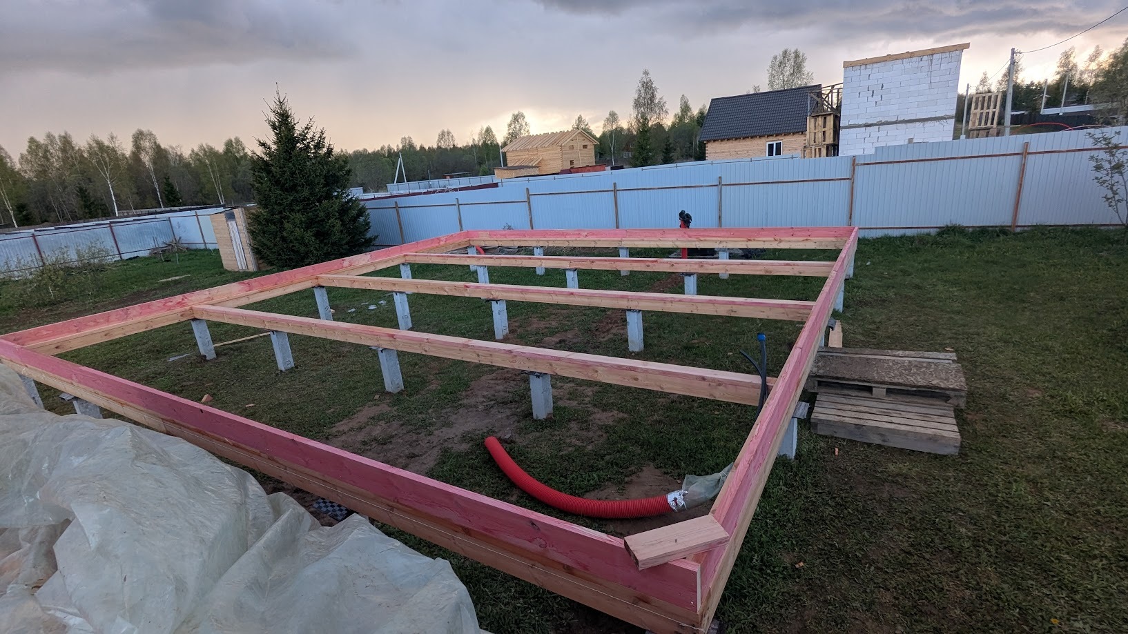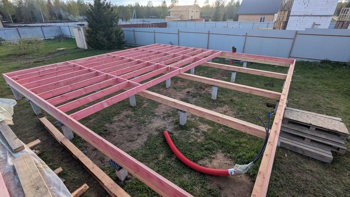 После обвязки начал собирать цокольное перекрытие: установил внешние доски