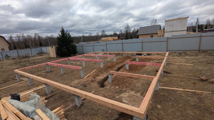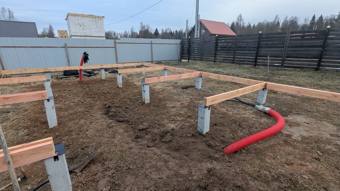 Однако в итоге сваи выровнены и я начал работу. Начал собирать обвязку свай и попеременно копать траншею для ввода воды от скважины.