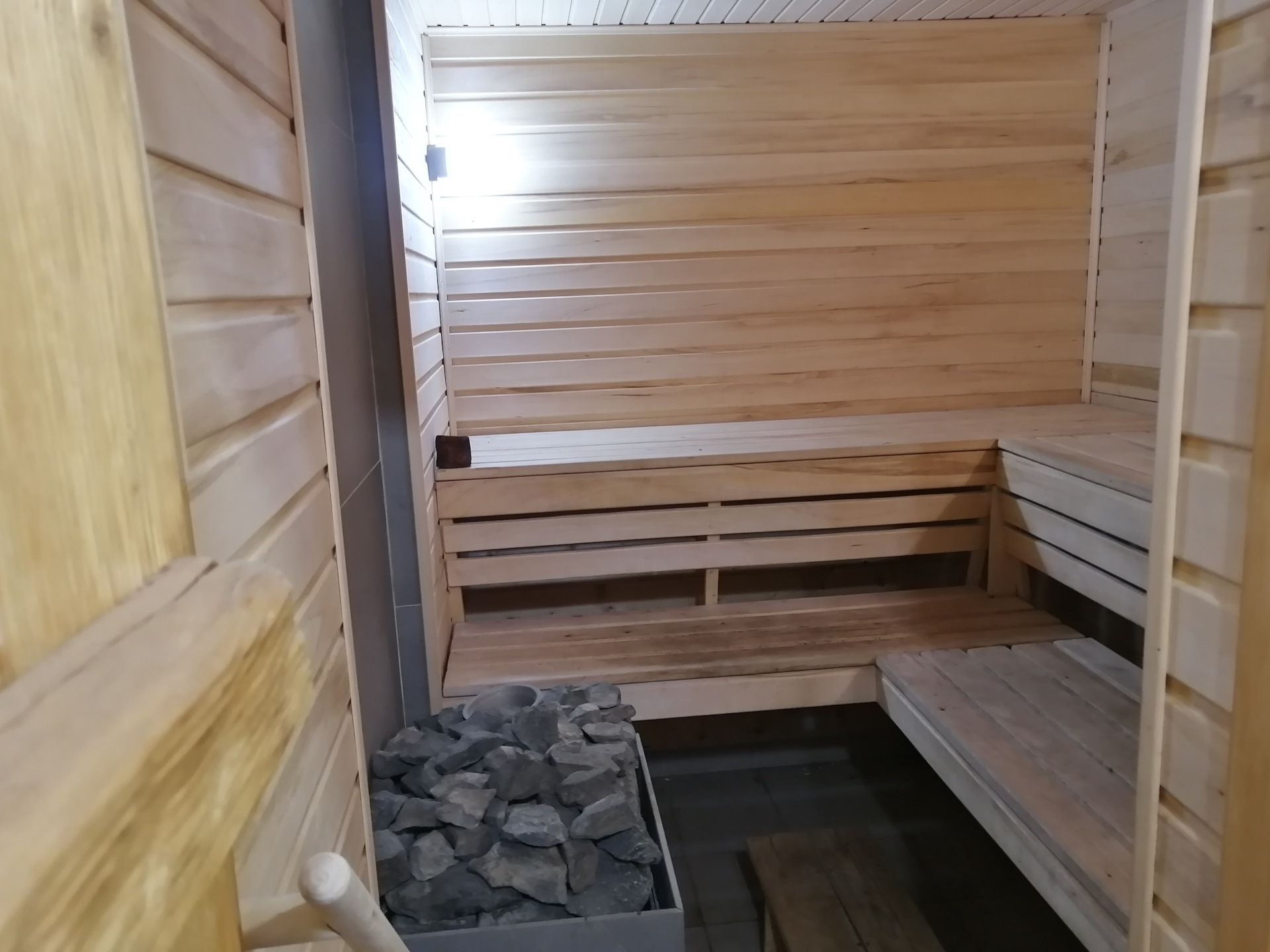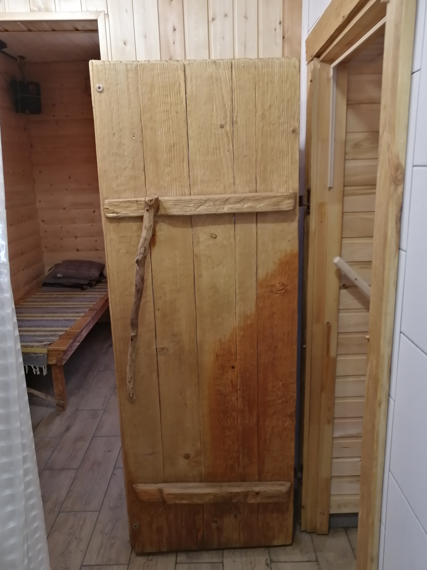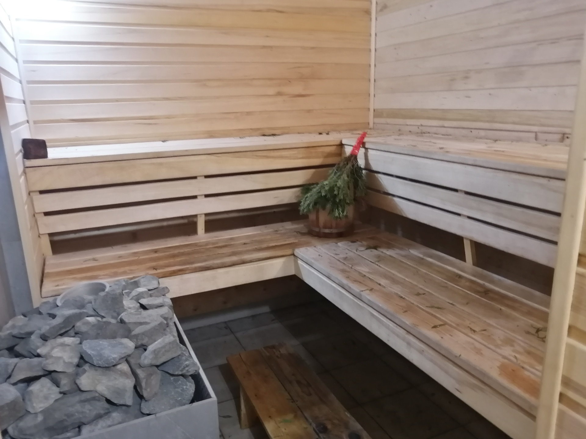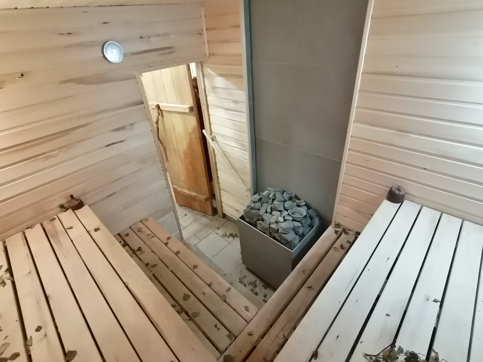 В парилке листья от березового веника не убрал с прошлой бани. Запах стоит приятный.