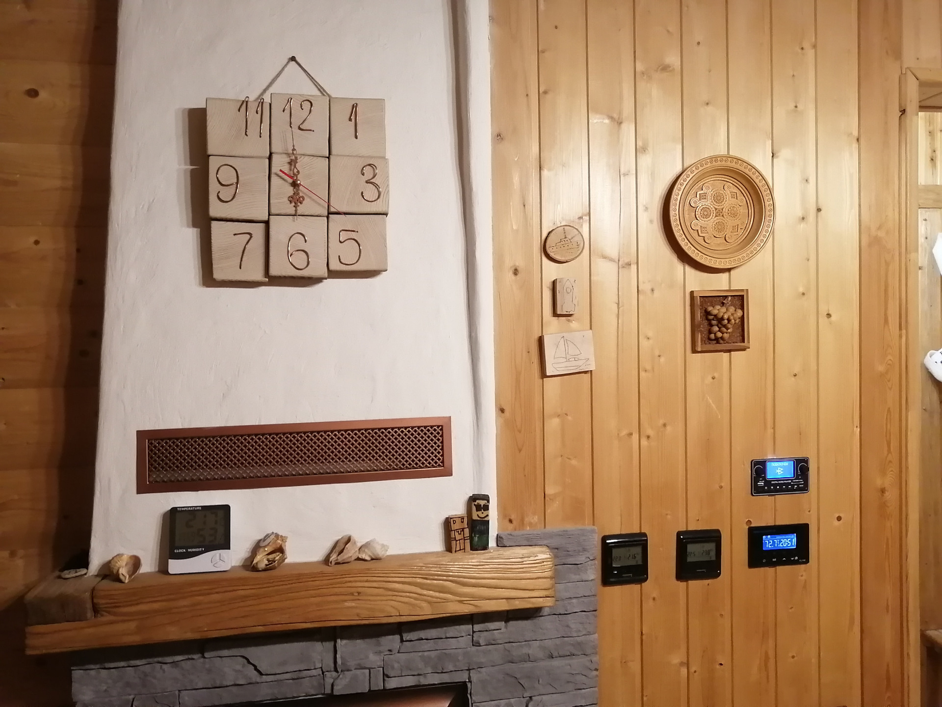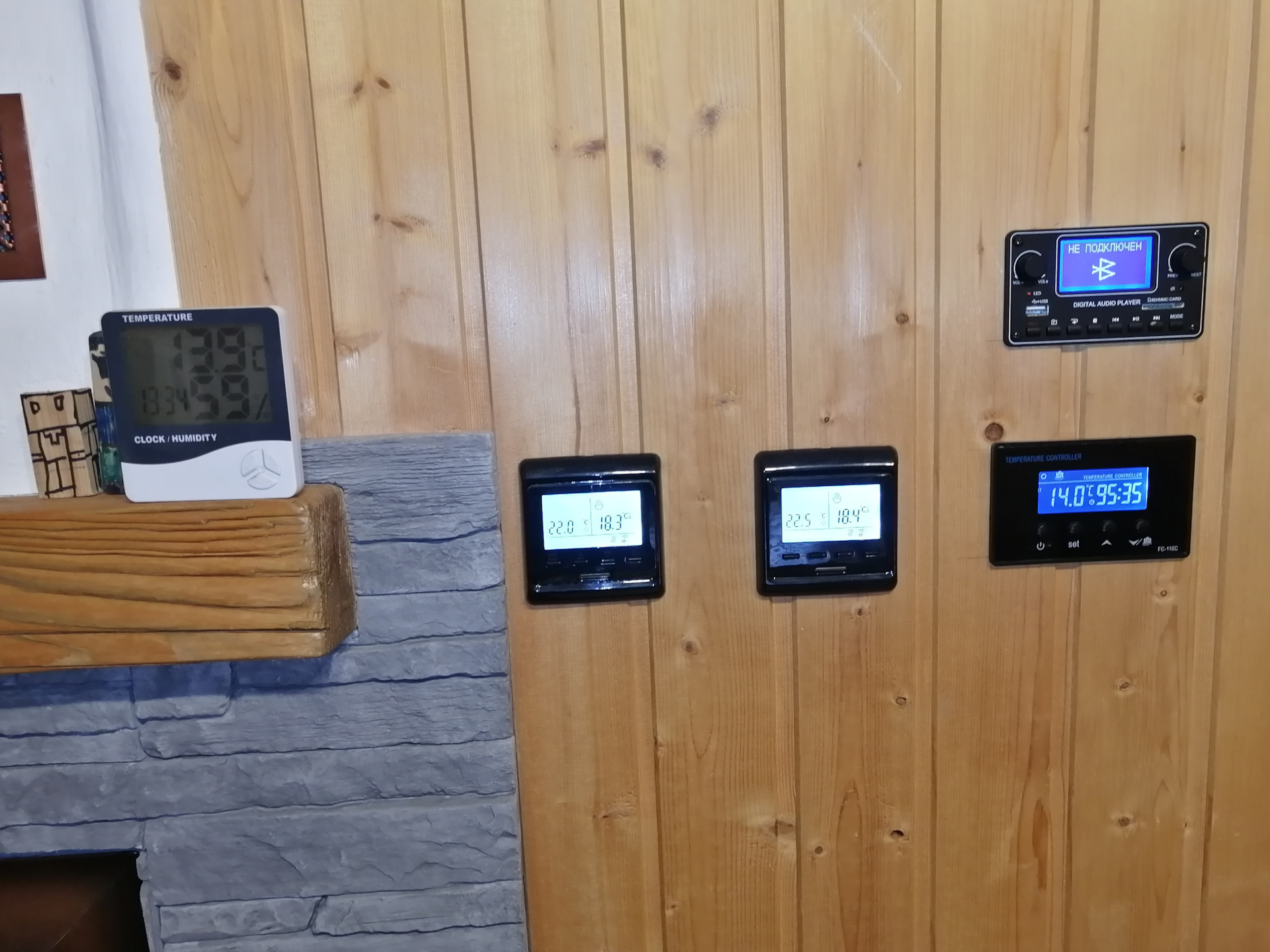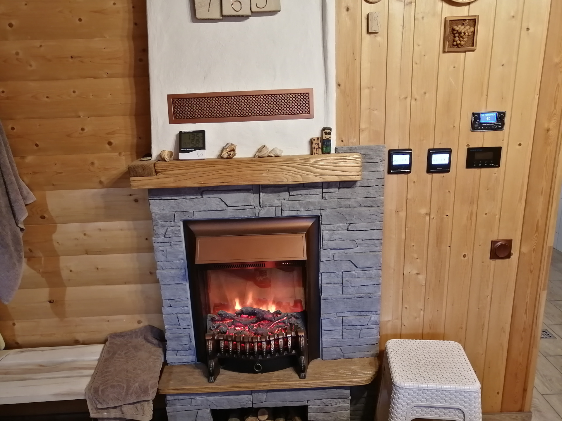 В шесть часов в парилке 73, в помещении бани 21 градус. Выключаю пол. Камин еще работает какой то время, до 23 градусов в помещении. Но это происходит быстро.
