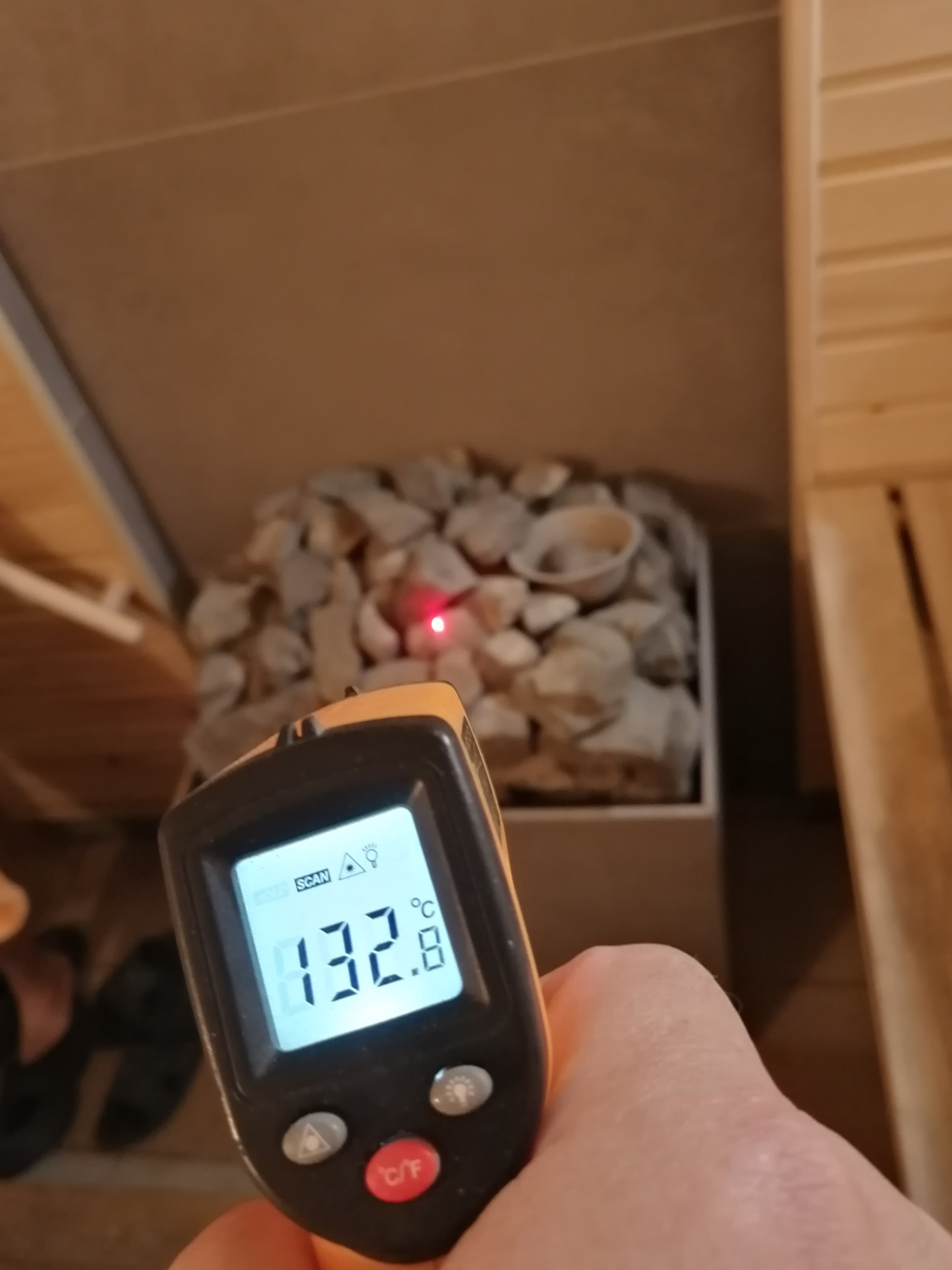 Можно делать первый заход. Через пол часа в парилке градусов 80. Выключаю камин и печь в парилке. Паримся далее от тепла 120 кг. камней. Между делом решил замерять градус на камнях печи.