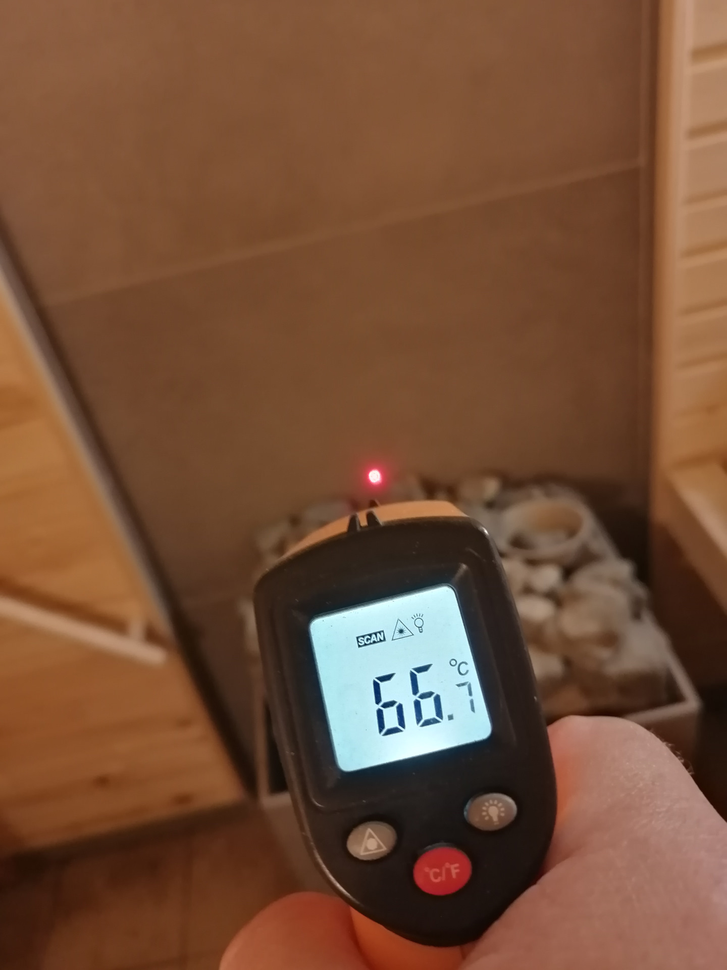 Кстати говоря. экран в самом теплом месте около 60 градусов, в пяти сантиметрах от печи. А в других местах и того меньше. А вот камни, бывало и поболее, чем 200 градусов нагревались.